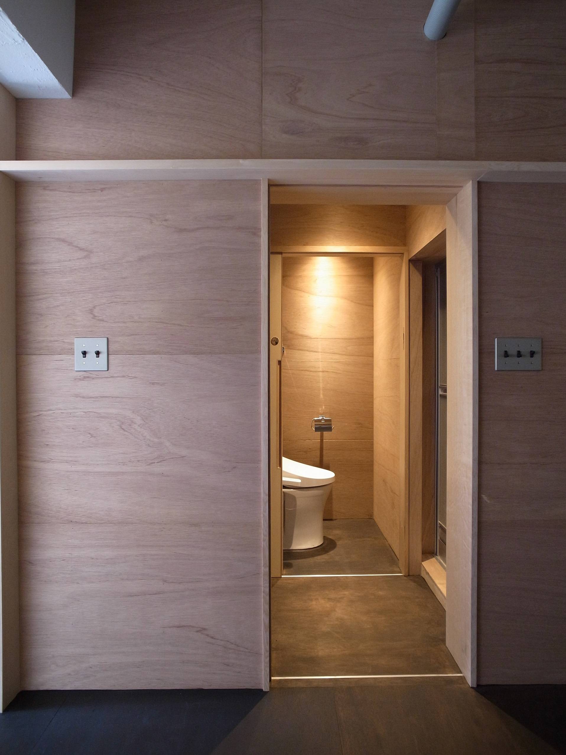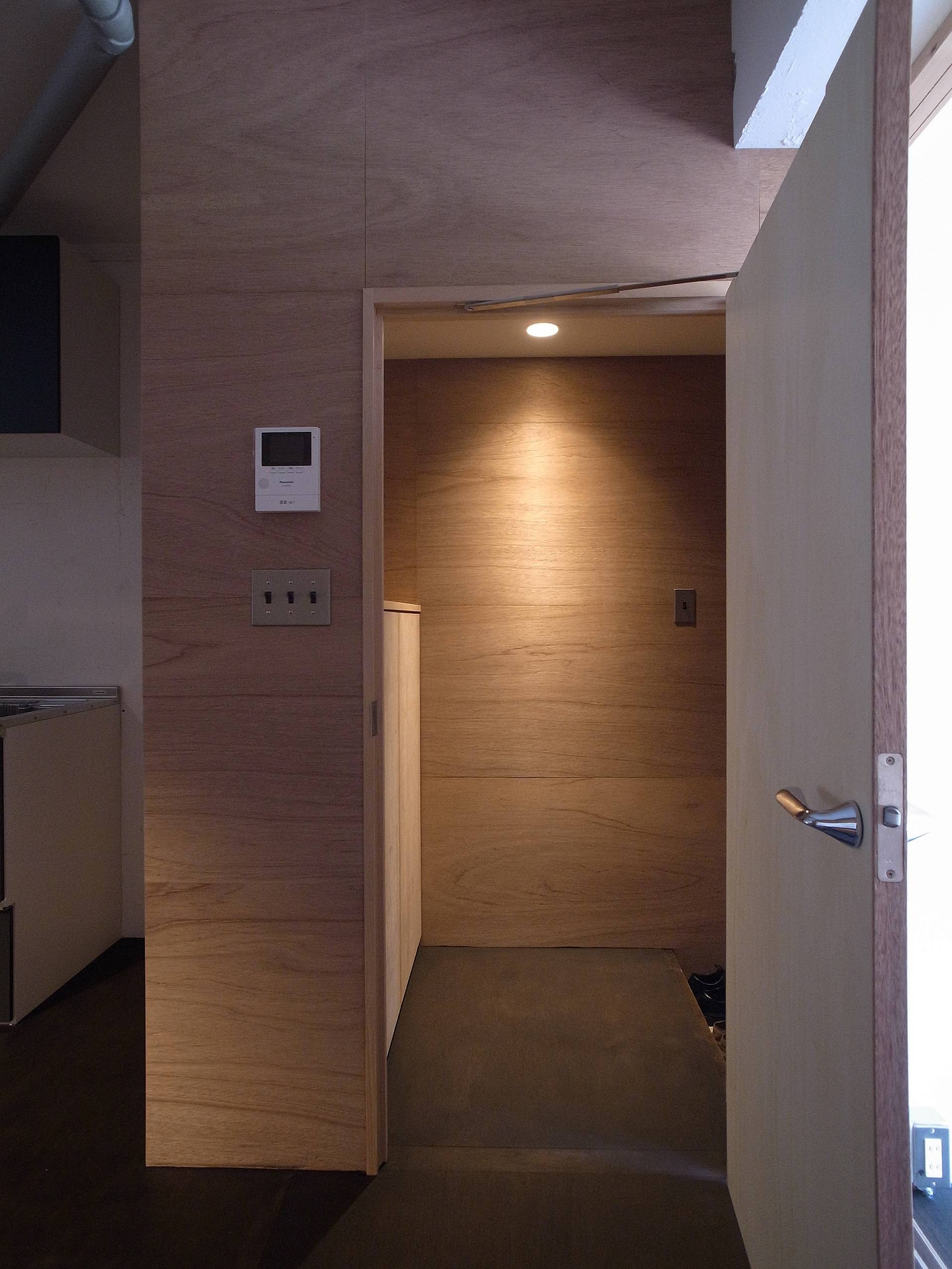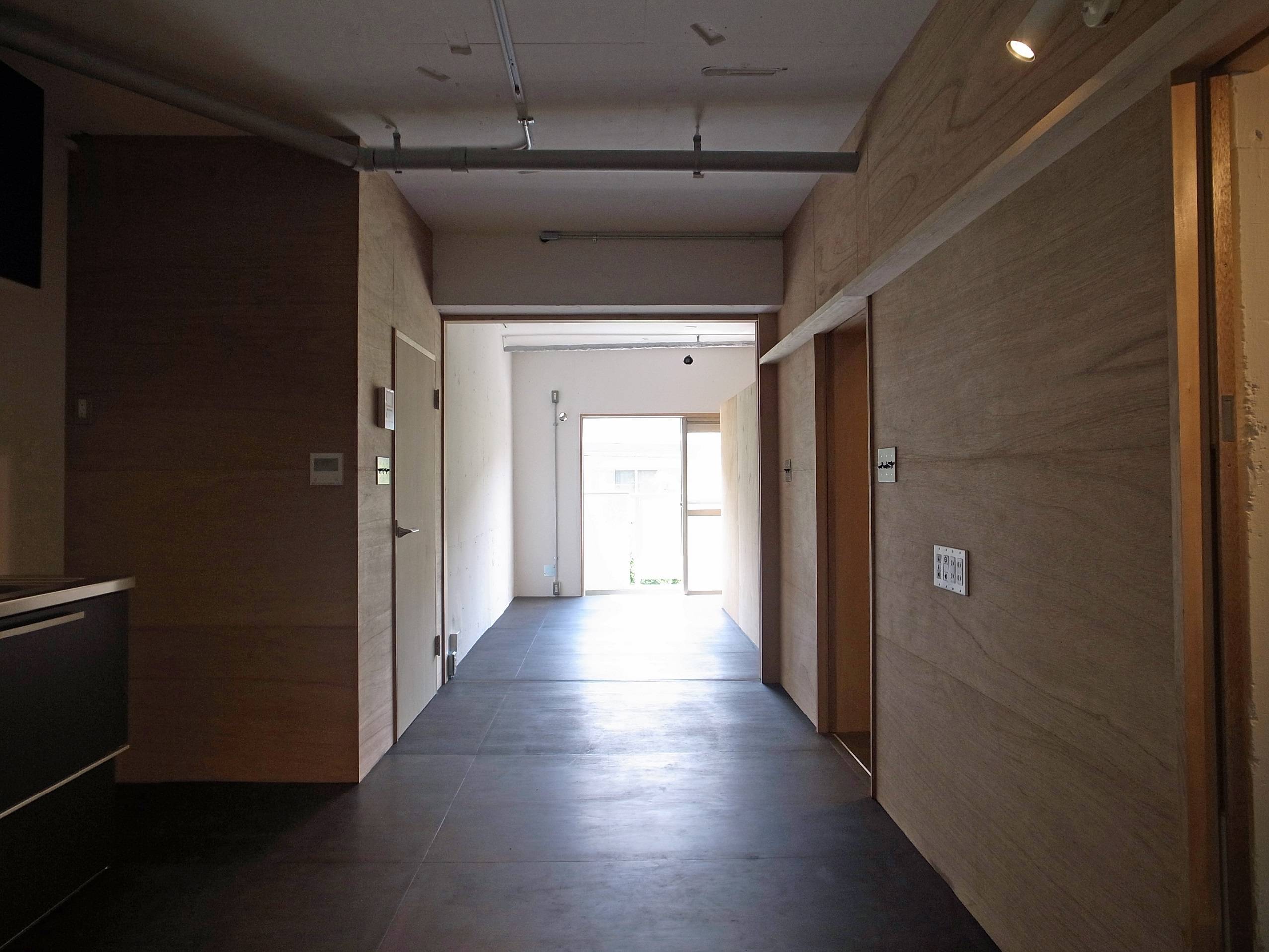 代官山の駅にほど近い立地ながら、静かな環境のマンションフルリノベーション。低予算という条件から、以前のプランから大幅な変更はせず、既存のRC壁を生かした設計とした。新設壁はラワン合板仕上げとし、水廻り以外は建具を開け放つとワンルームとなる。ワンルームとなった空間には東西に気持ちの良い風が流れ、マンション特有の風が抜けないプランにならないように配慮した。西側寝室の収納部分は建具で仕切らず、使い勝手を良くするため回遊動線とした。その結果、収納にも風が抜け、湿気たまりがなくなる。東側居間、ワークルームは緑を望むことができ、穏やかな光が差し込む落ち着いた場、中央の食堂・台所は東西の窓が望め、風の通りを一番感じられる仄暗く、安堵感のある場となった。