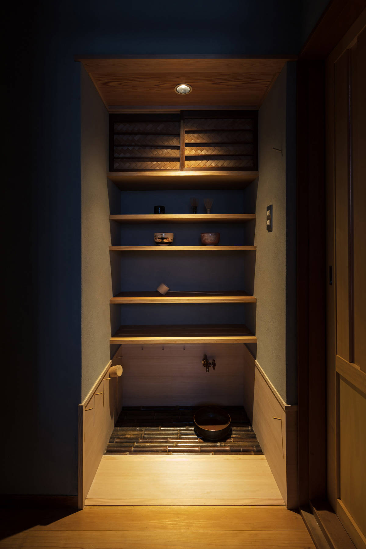 奈良市北部。築約40年の戸建て住宅リノベーションです。お施主様は60代のご夫婦と息子さん。長年愛着を持って住んでこられた数奇屋風の住宅は随所に粋な意匠が見られるものの、深い庇のために室内は南側でも薄暗く、押入れや収納が少ないために家の大半が物置と化している状態でした。耐震補強と断熱工事を行い、使われていなかった天井裏を活用して開放感のある居間をつくり、和室には炉を切り水屋を設けて茶室の設えに変更、クローゼットやパントリー、書棚や収納家具など用途別に十分な容量の収納を確保し、元々の意匠を生かしつつ将来に渡って快適に暮らすことが出来、お施主様のご趣味の美術や骨董、そして家や庭を存分に愛でることが出来る住まいになりました。