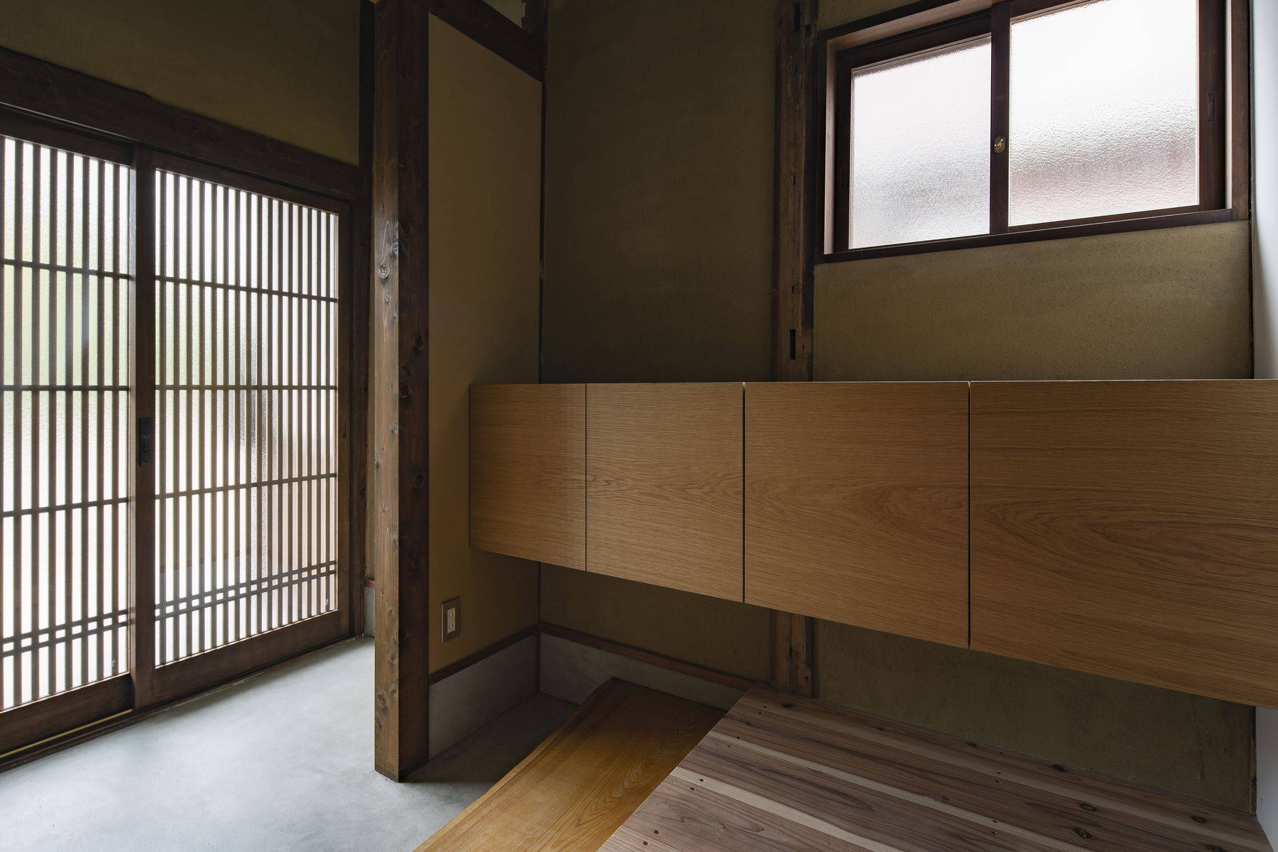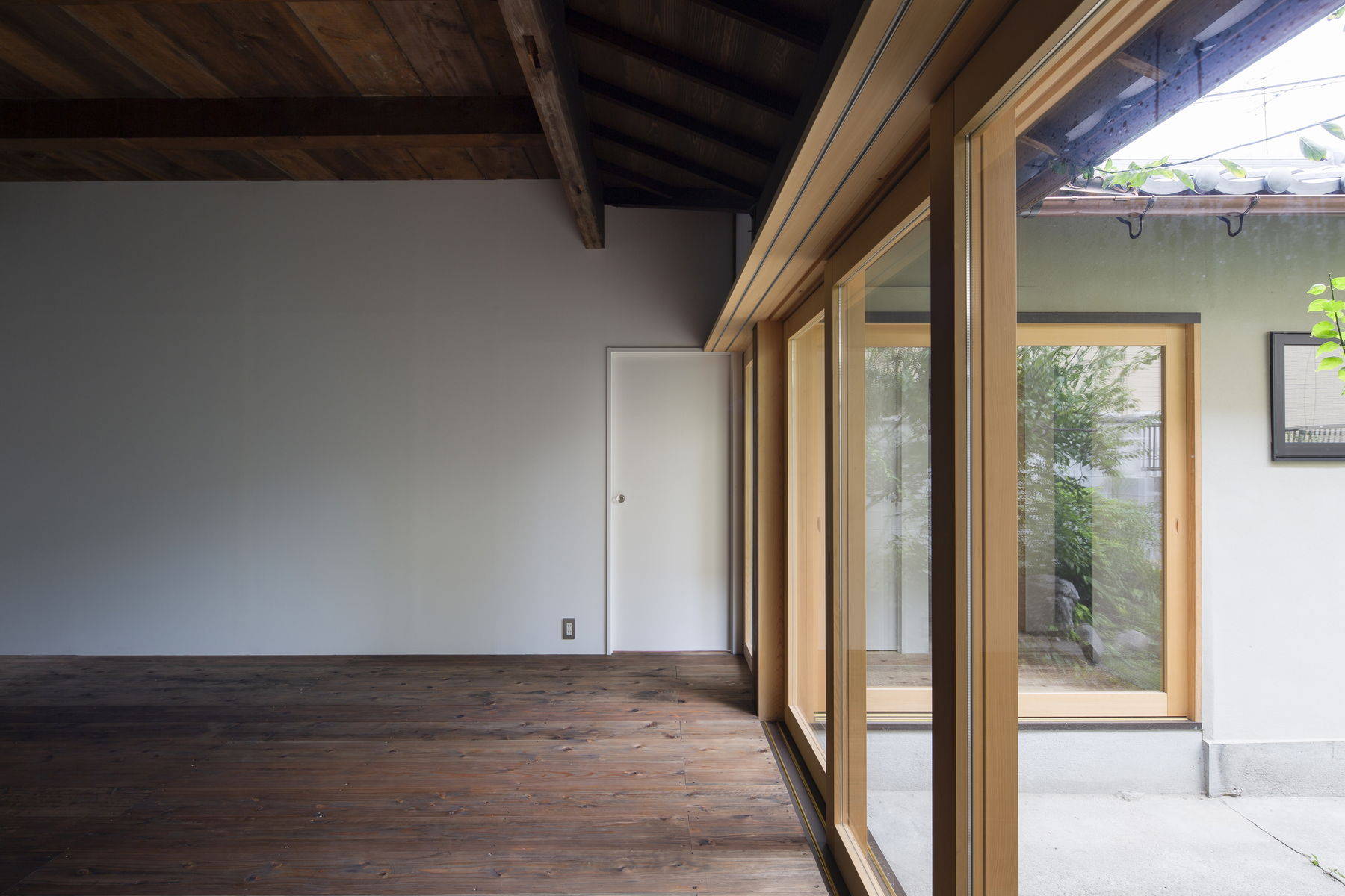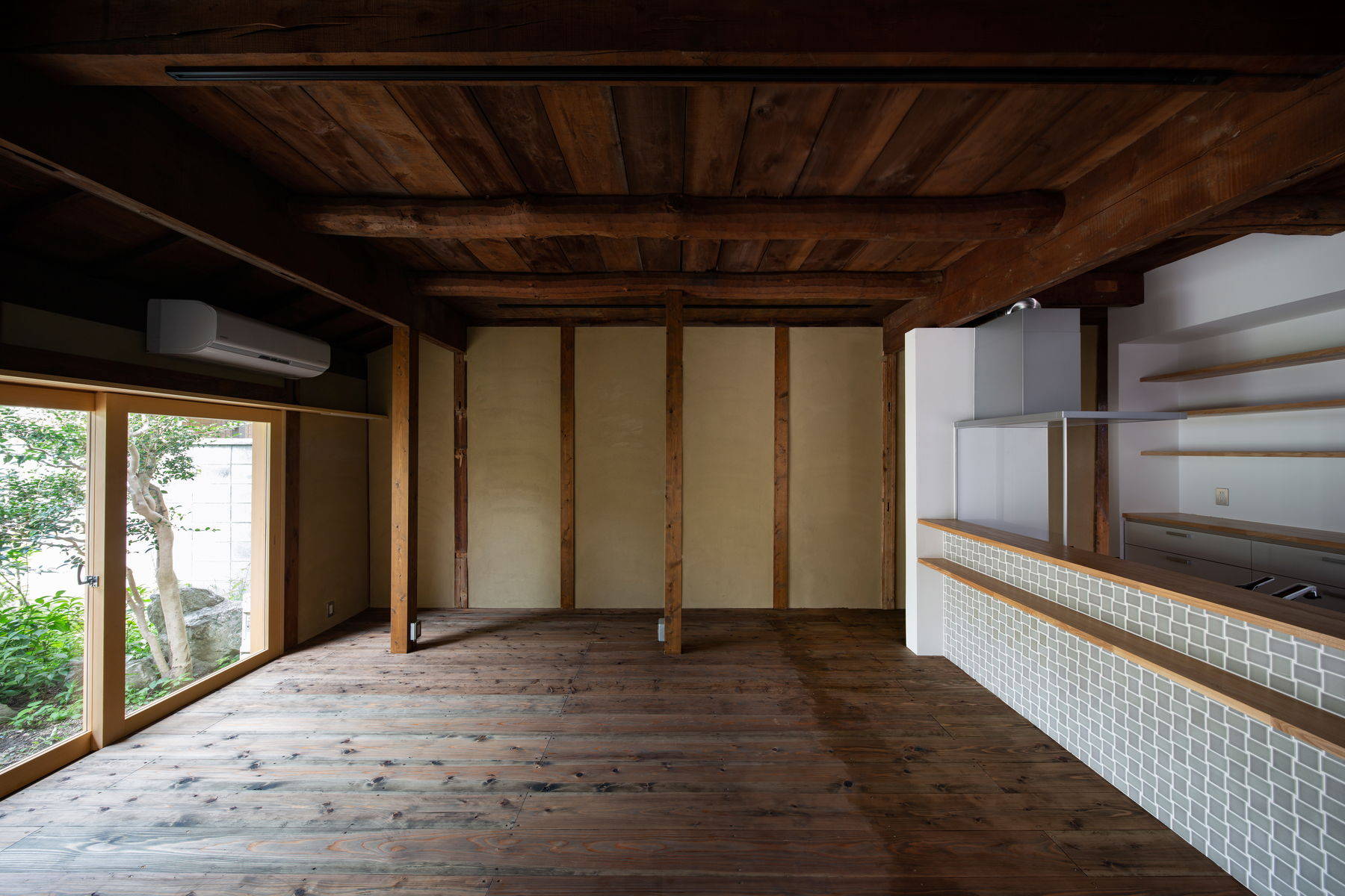 奈良市の旧道沿いに建つ大正期の町屋。建物の骨格はしっかりしているものの、玄関や道路側の和室はテナント貸しするために大幅に増改装され、その後空き家となって放置されていました。奈良市の補助金を活用することで木格子や庇、焼杉壁、瓦屋根といった町屋の意匠を復原し、内部は古い柱梁や天井板を活かしつつ耐震補強を施し現代的な住み方に合わせてリノベーションしました。一階は大きなリビングと庭を見ながら調理できるアイランドのダイニングキッチン、回遊性の高いバックヤードとコンパクトな水回り。二階は多目的に使える天井の高いワンルーム。厨子二階の下屋を吹き抜けに変更して玄関と鉄骨階段を新設しました。