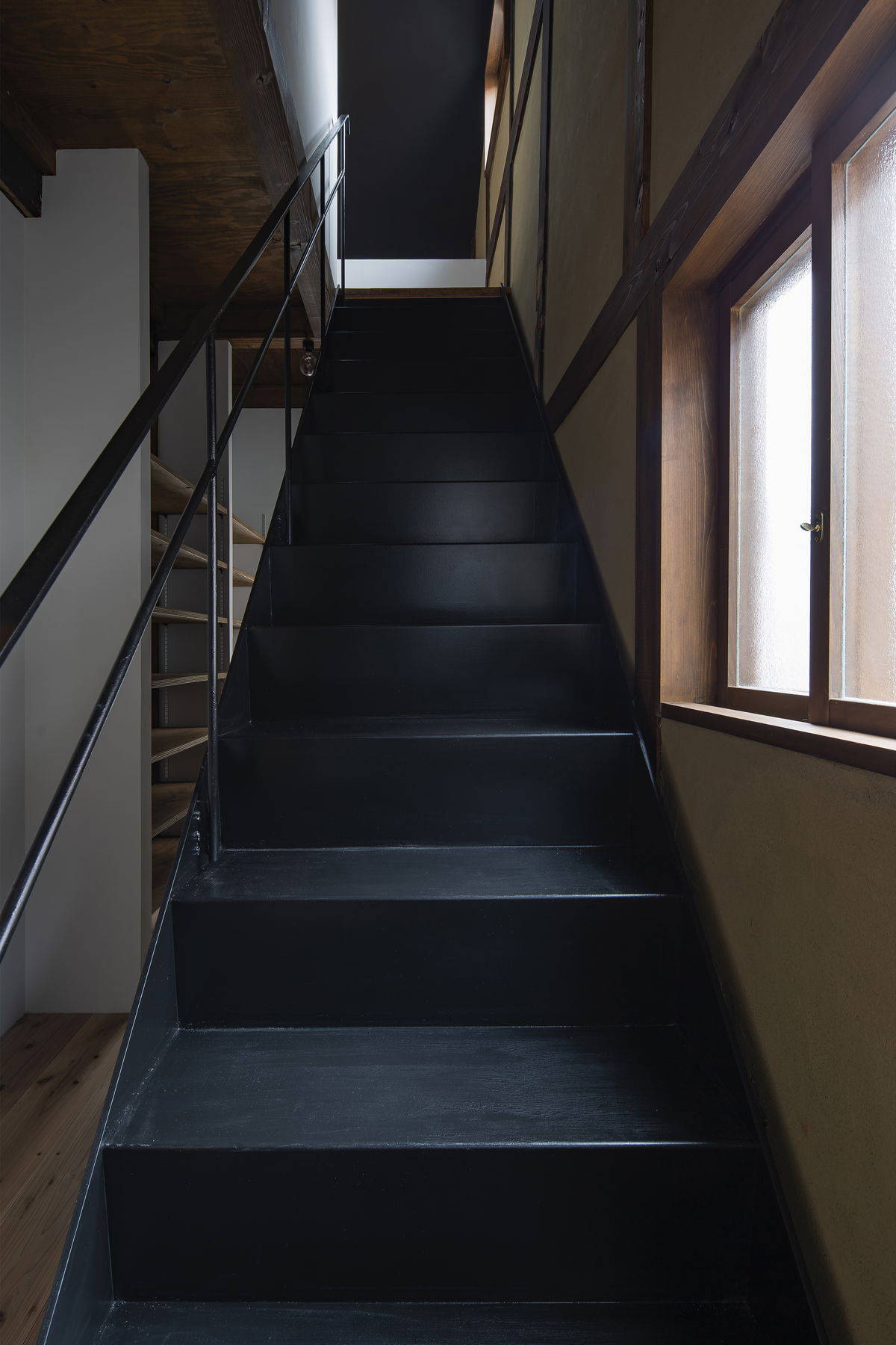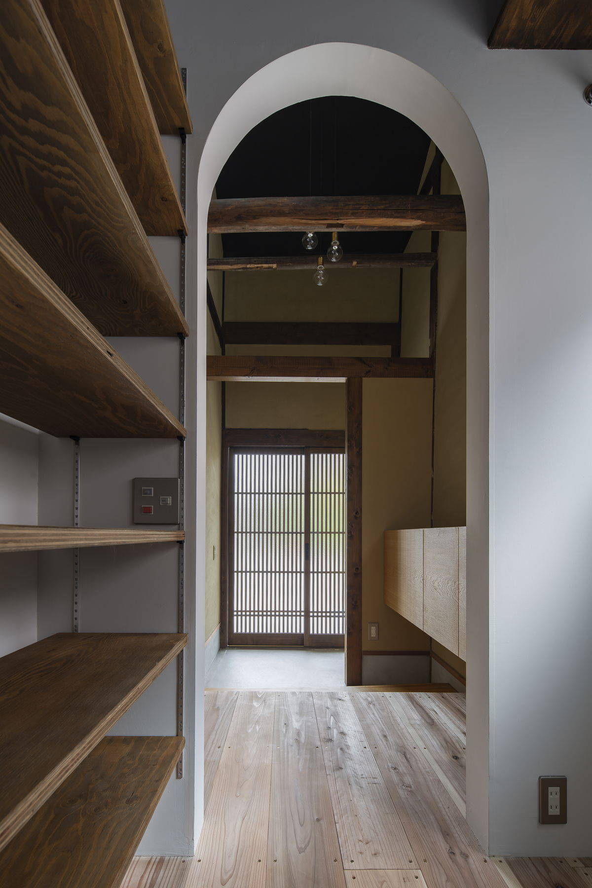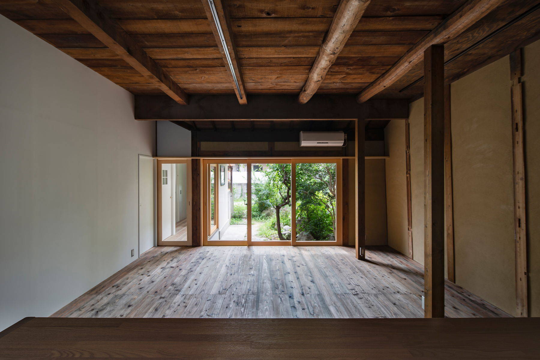 奈良市の旧道沿いに建つ大正期の町屋。建物の骨格はしっかりしているものの、玄関や道路側の和室はテナント貸しするために大幅に増改装され、その後空き家となって放置されていました。奈良市の補助金を活用することで木格子や庇、焼杉壁、瓦屋根といった町屋の意匠を復原し、内部は古い柱梁や天井板を活かしつつ耐震補強を施し現代的な住み方に合わせてリノベーションしました。一階は大きなリビングと庭を見ながら調理できるアイランドのダイニングキッチン、回遊性の高いバックヤードとコンパクトな水回り。二階は多目的に使える天井の高いワンルーム。厨子二階の下屋を吹き抜けに変更して玄関と鉄骨階段を新設しました。