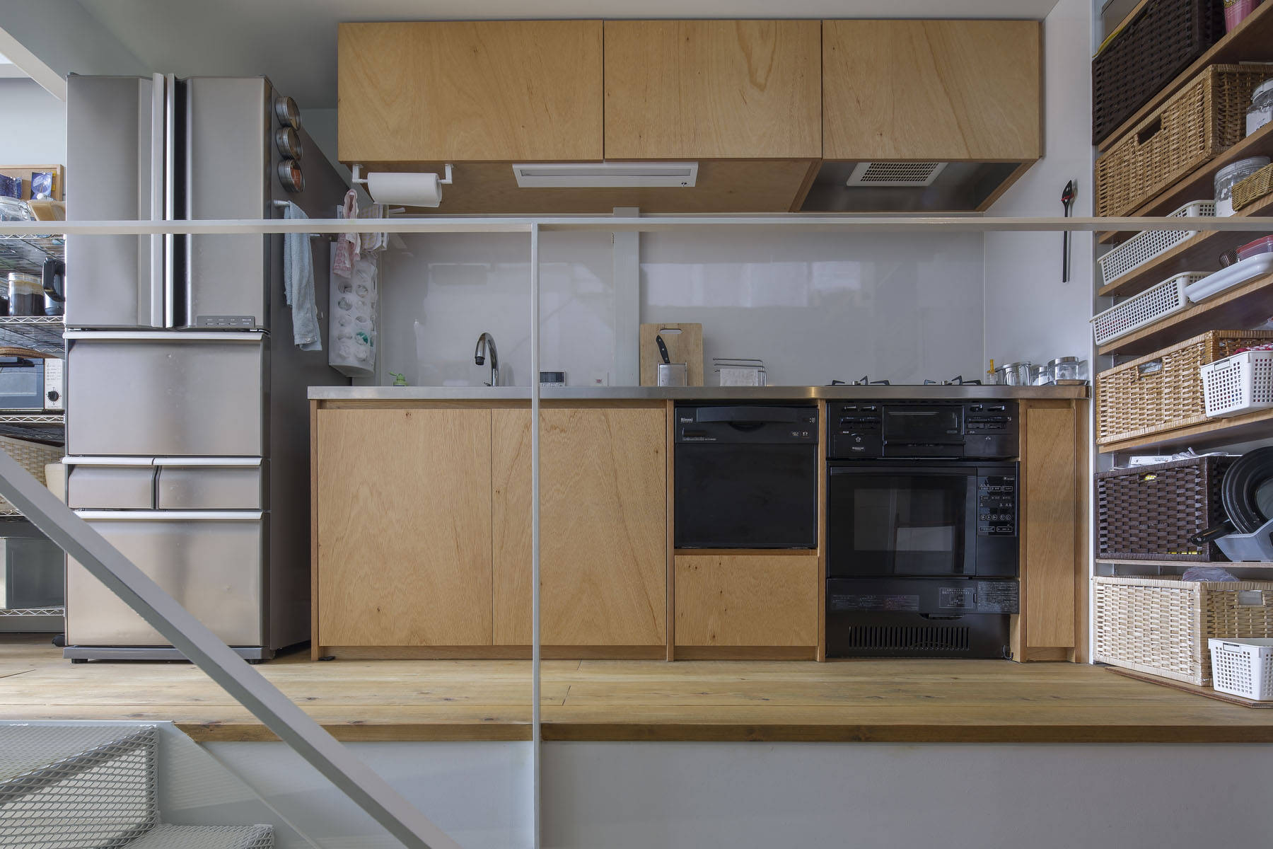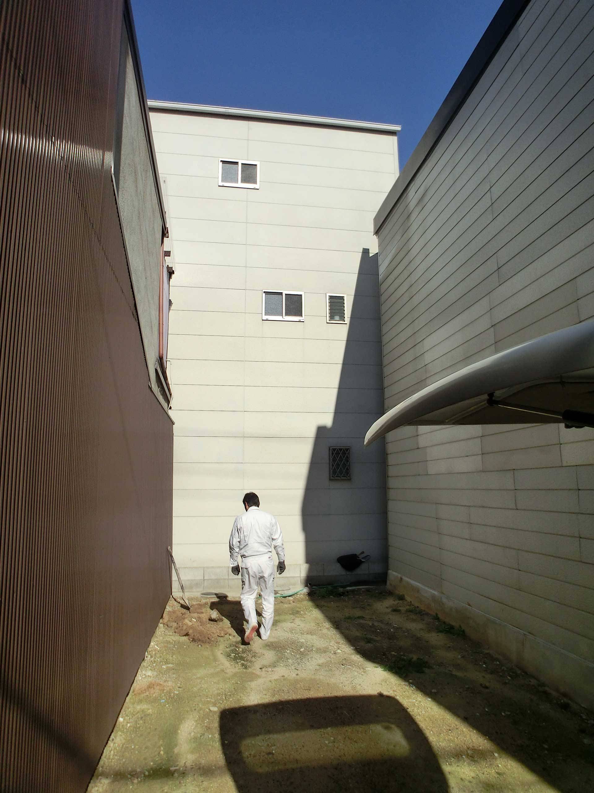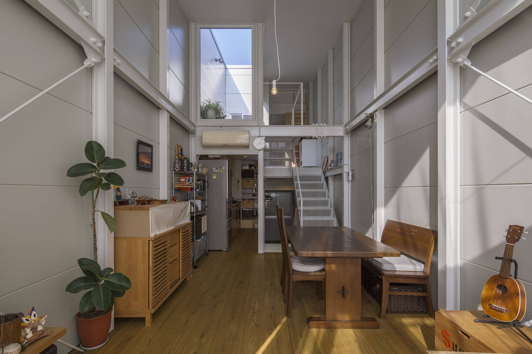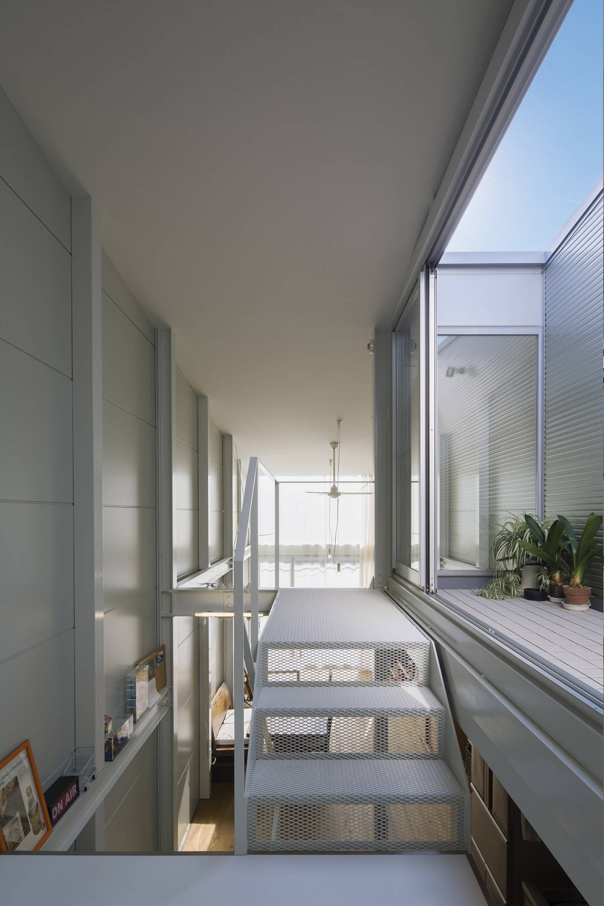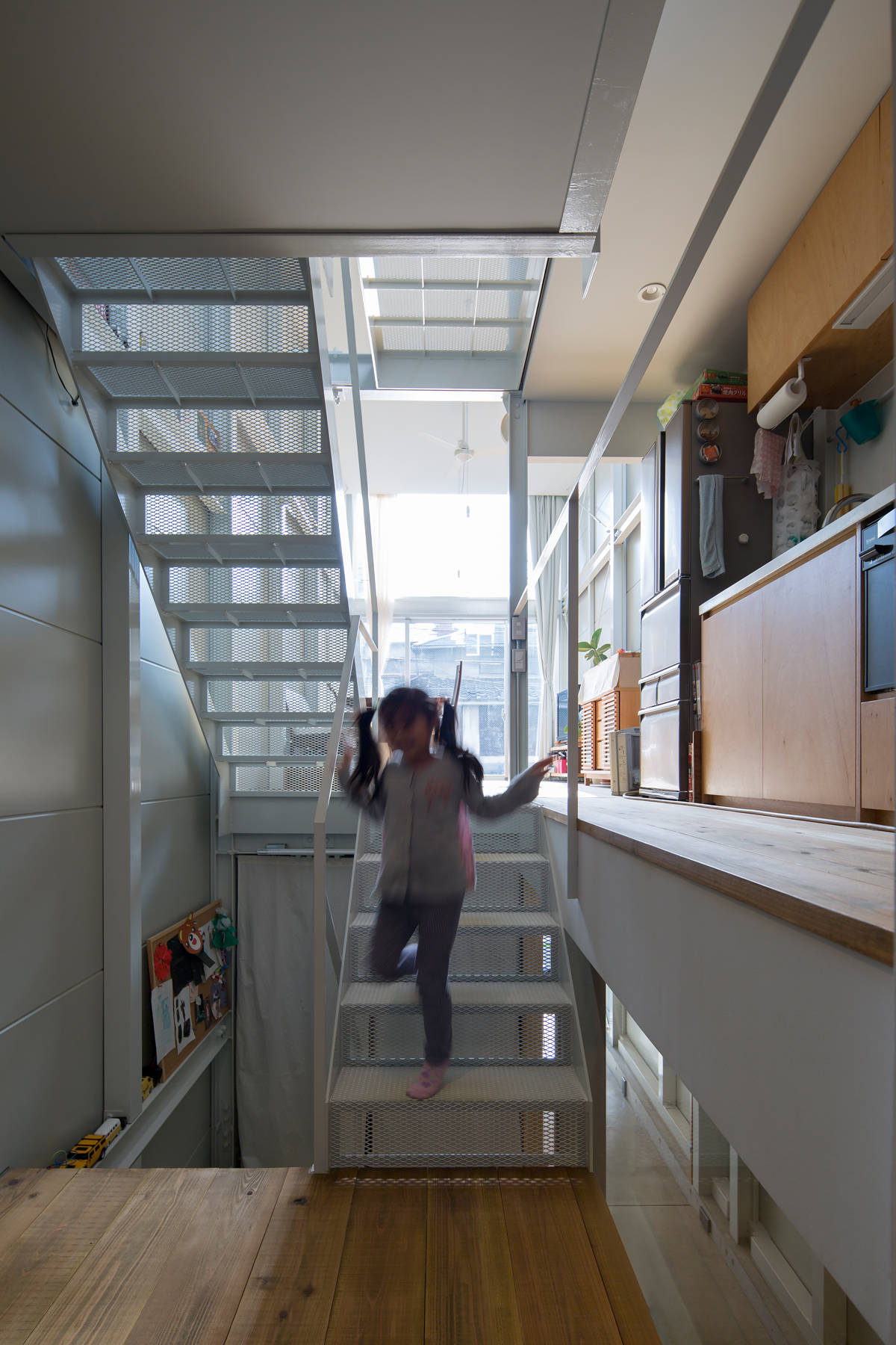 大阪市内の非常に狭い間口の土地に建つ住宅です。厳しい条件の中で、上下階の移動を制約としてではなく様々な性格を持つ空間のつながりとして楽しめるよう、1つのハコの中に6つの『』型の床面をつくり、半階ずらしながら積み重ねることで長手・短手両方向にスキップフロアとしての性格を持たせ、止まり木を枝から枝へ飛び移るような住まいを計画しました。敷地を極限まで活用するため、100mm幅の鉄骨架構を組み上げた後で金属断熱サンドイッチパネルを隣地境界際に沿って内側から施工し、外壁を50mmの厚さに抑えています。法規上の取り扱いを地上2階地下1階建てとすることで鉄骨被覆や非常用進入口を避け、最上階にはルーフテラスを設けて、倉庫のようにスパルタンでありながら、光と風に満たされて圧迫感を感じない住まいになりました。