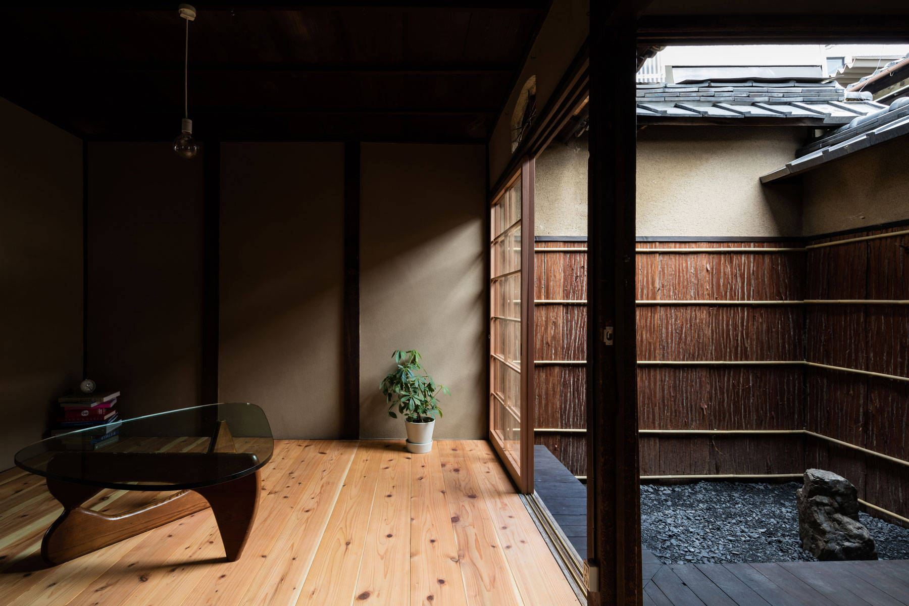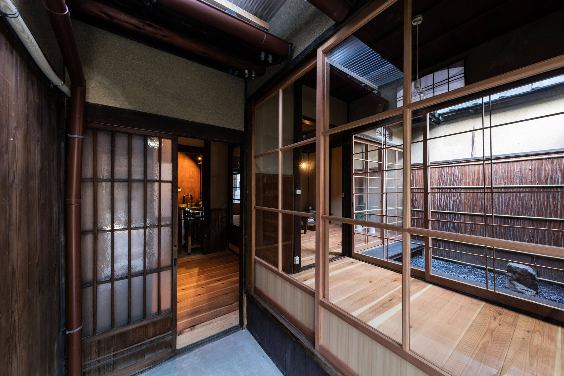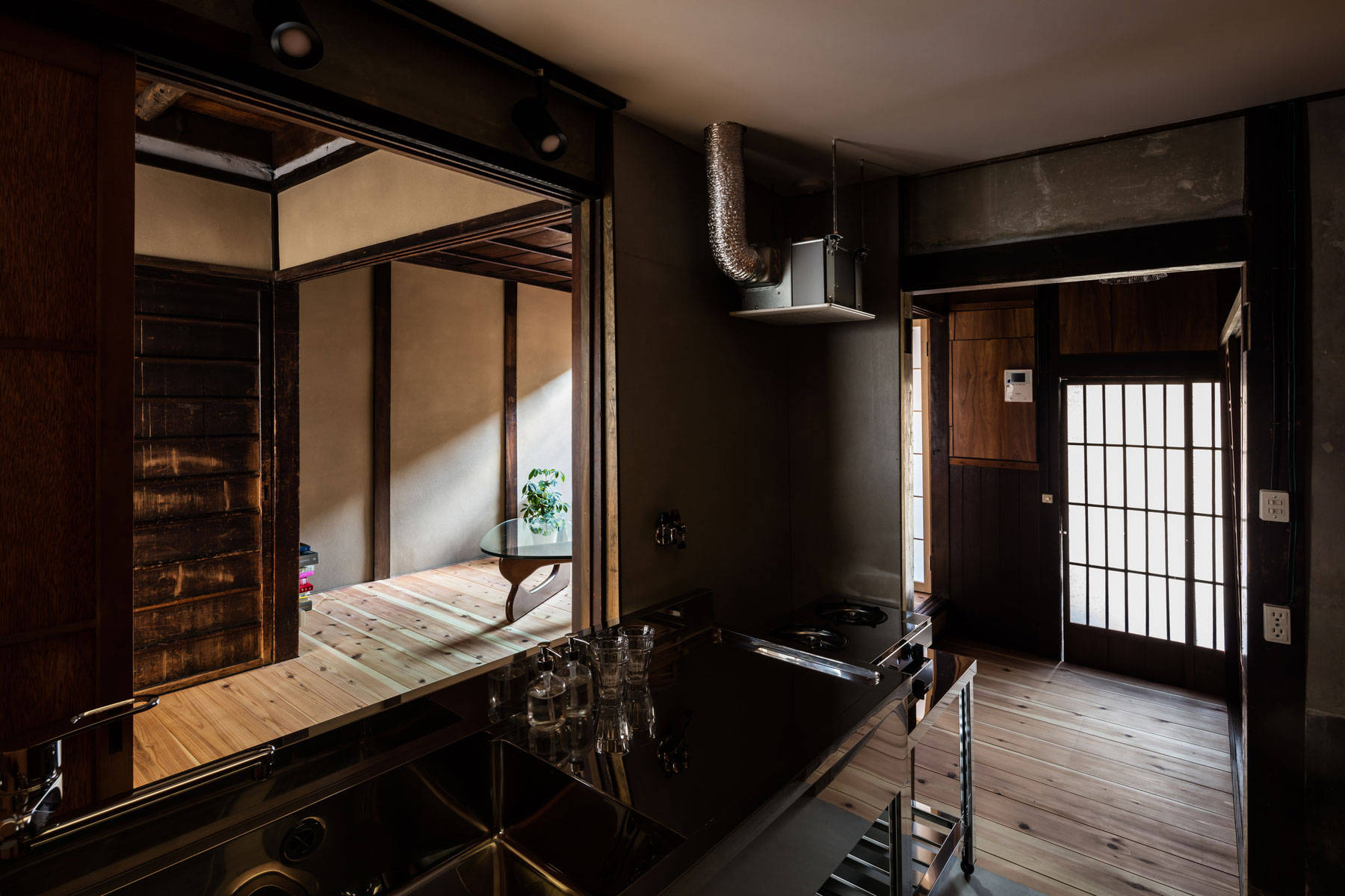 京都市東山区。国道1号線から1本入った細い路地には戦前に建てられた古い長屋がひしめいています。昭和の古き良き路地の面影を残しながらも、空き家問題、建物の老朽化、観光客によるプライバシーの侵害、インバウンド需要に伴う民泊・ゲストハウス化など、現代的な問題にも直面しています。今回は長屋を所有する家主さまからのご依頼で、その一角を子育て世帯や高齢者向けの賃貸物件としてリノベーションすることになりました。建物は数年間放置されていたため損傷が激しいものの、ビニルクロス、アルミサッシ、システムキッチンといった継ぎはぎリフォーム部分を撤去すると、京町屋ならではの繊細な構造と雅な意匠、屋外と屋内が一体となった気持ち良い空間が蘇りました。 1階は和室だった2部屋をつなげた居間を中心に、坪庭を囲む見世の間、建具を介して向かい合うキッチンとも一体的に利用できる間取りに変更。限られたスペースの中に浴室・洗面室・洗濯機・冷蔵庫の設置場所も確保しています。床材は30mm厚の杉フローリングを用いてローコストながら断熱性を向上、壁は左官と合板にて補修、天井は劣化部分を剥がして2階床の荒板仕上げ。キッチンは業務用厨房機器を組み合わせたシンプルなつくりに。2階は間取りの変更は行わず劣化部分を修繕。天井は構面補強と断熱材を付加した上で船底天井に変更。グリッドプランを生かして、家中の建具を必要に応じて配置換えして再利用し、新たに製作する枚数を極力減らしました。 リノベーションにあたっては京都市の補助金制度を最大限活用し、イニシャルコストの低減に努めています。