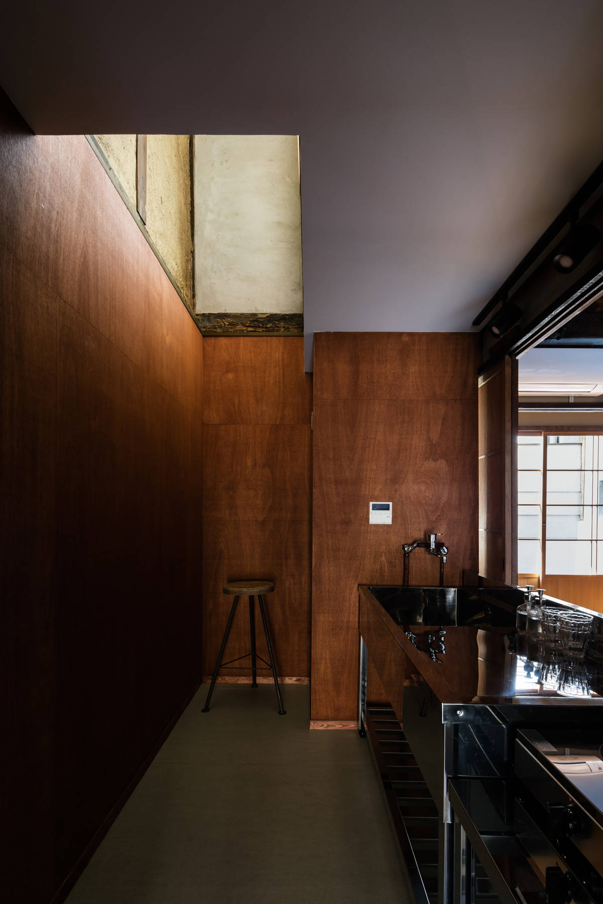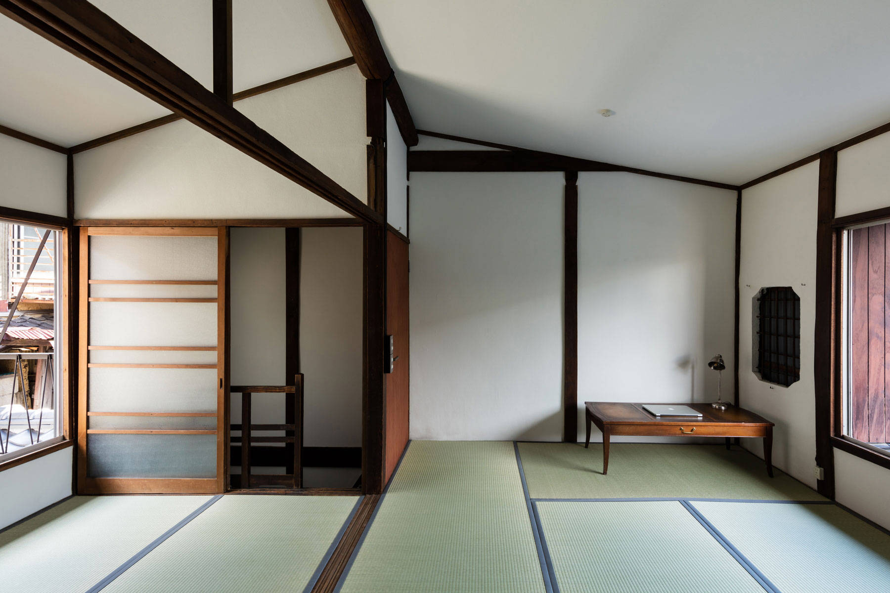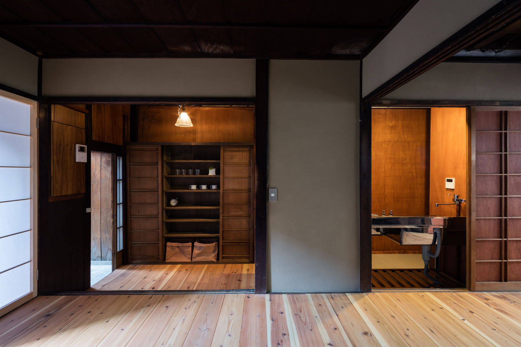 京都市東山区。国道1号線から1本入った細い路地には戦前に建てられた古い長屋がひしめいています。昭和の古き良き路地の面影を残しながらも、空き家問題、建物の老朽化、観光客によるプライバシーの侵害、インバウンド需要に伴う民泊・ゲストハウス化など、現代的な問題にも直面しています。今回は長屋を所有する家主さまからのご依頼で、その一角を子育て世帯や高齢者向けの賃貸物件としてリノベーションすることになりました。建物は数年間放置されていたため損傷が激しいものの、ビニルクロス、アルミサッシ、システムキッチンといった継ぎはぎリフォーム部分を撤去すると、京町屋ならではの繊細な構造と雅な意匠、屋外と屋内が一体となった気持ち良い空間が蘇りました。 1階は和室だった2部屋をつなげた居間を中心に、坪庭を囲む見世の間、建具を介して向かい合うキッチンとも一体的に利用できる間取りに変更。限られたスペースの中に浴室・洗面室・洗濯機・冷蔵庫の設置場所も確保しています。床材は30mm厚の杉フローリングを用いてローコストながら断熱性を向上、壁は左官と合板にて補修、天井は劣化部分を剥がして2階床の荒板仕上げ。キッチンは業務用厨房機器を組み合わせたシンプルなつくりに。2階は間取りの変更は行わず劣化部分を修繕。天井は構面補強と断熱材を付加した上で船底天井に変更。グリッドプランを生かして、家中の建具を必要に応じて配置換えして再利用し、新たに製作する枚数を極力減らしました。 リノベーションにあたっては京都市の補助金制度を最大限活用し、イニシャルコストの低減に努めています。