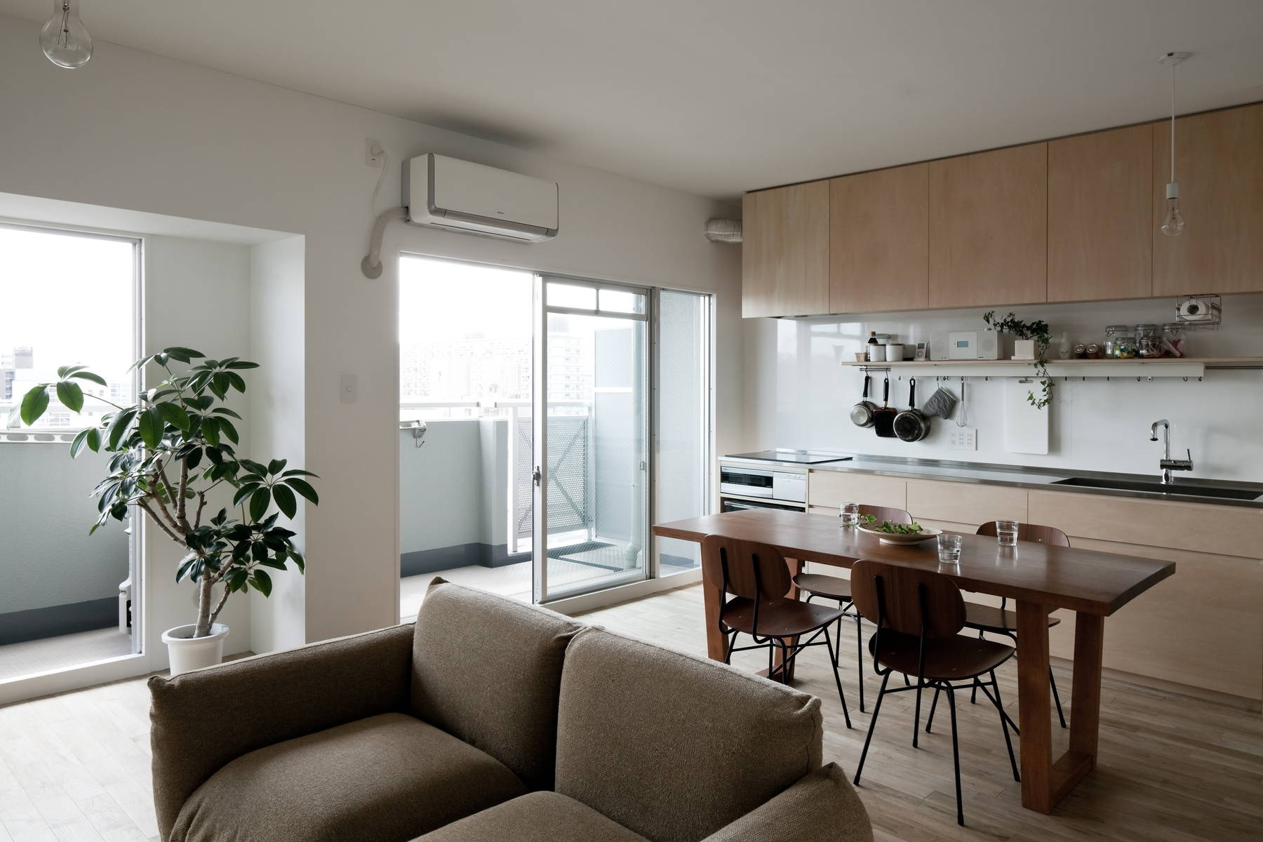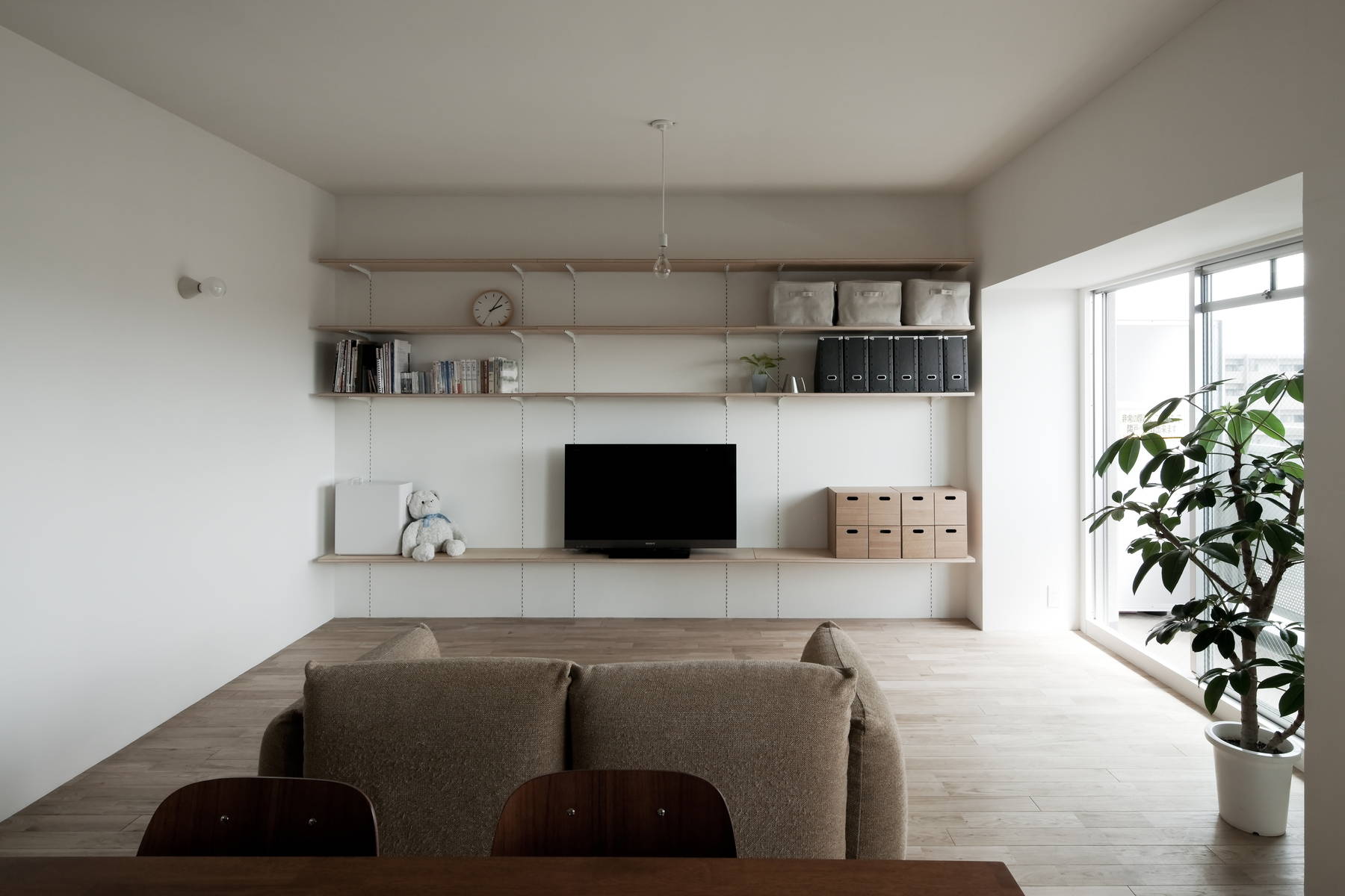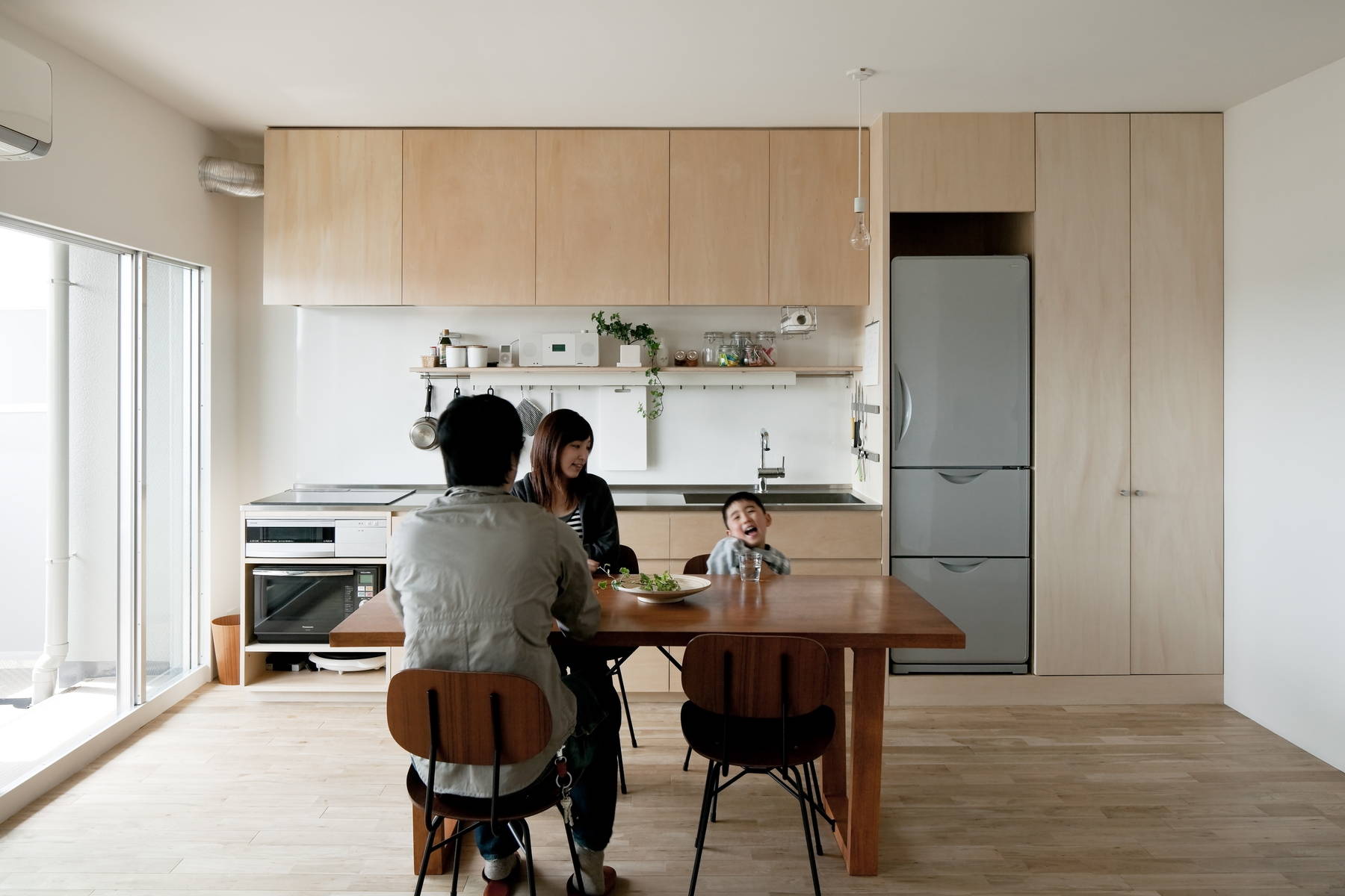 若いご家族のためのシンプルなマンションリノベーションです。一般的に中古マンションは流通上の効果を期待して必要以上に部屋を細分化し、室数を水増しする傾向があります。今回のマンションも形式的には一応3LDKではあるもののLDKはダイニングテーブルを置くのが精いっぱい、生活の中心となるスペースが無い状態でした。限られた予算とスペースの中で充分な生活空間を確保するため、天井や不要な間仕切りを取り払って大きなLDKをつくり、必要最小限のキッチンと多目的な可動棚のみを合板で製作しました。肌触りの良い無垢フローリングの上で半椅子座・半床座の気取らない生活を送ることができます。