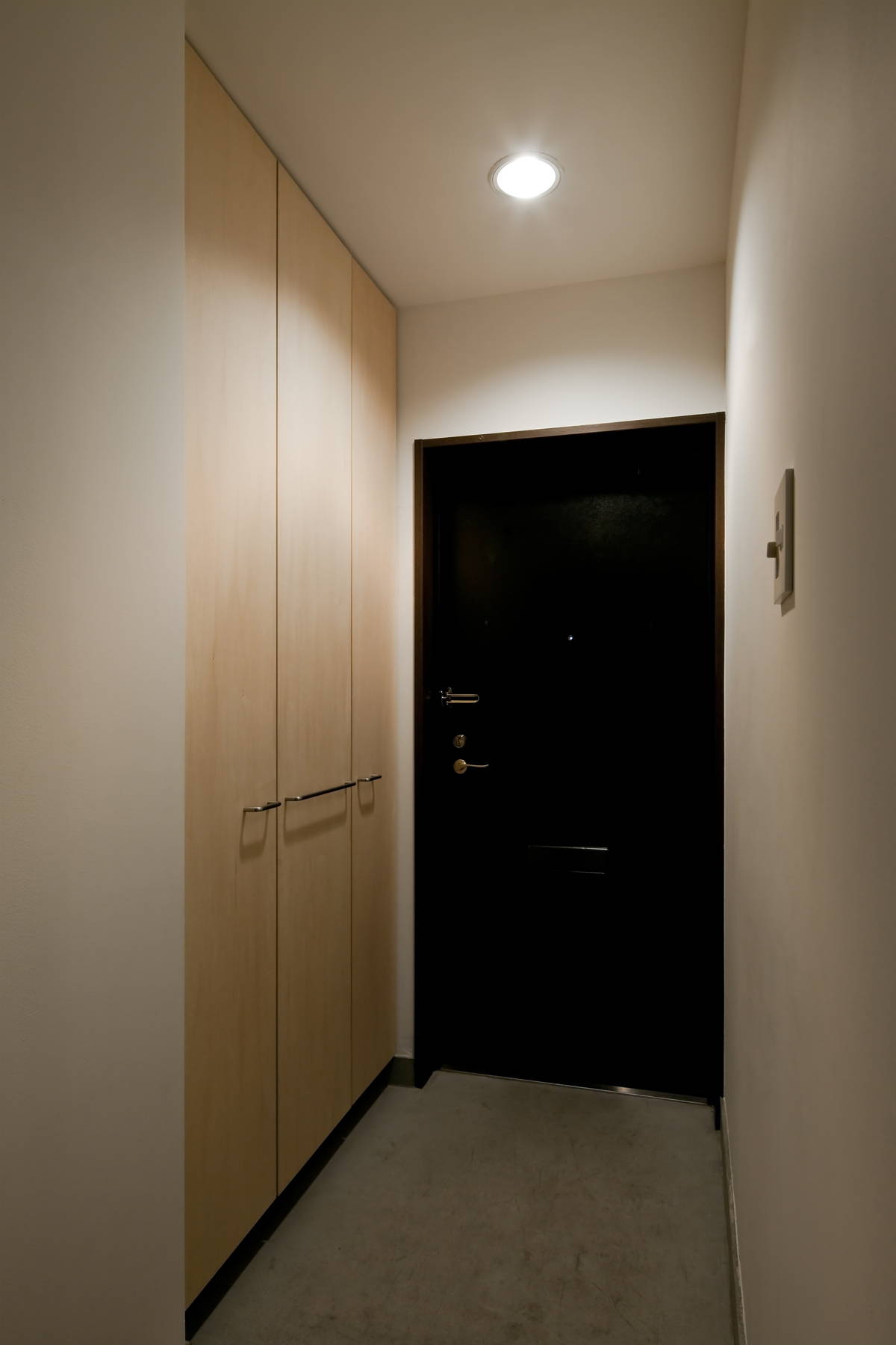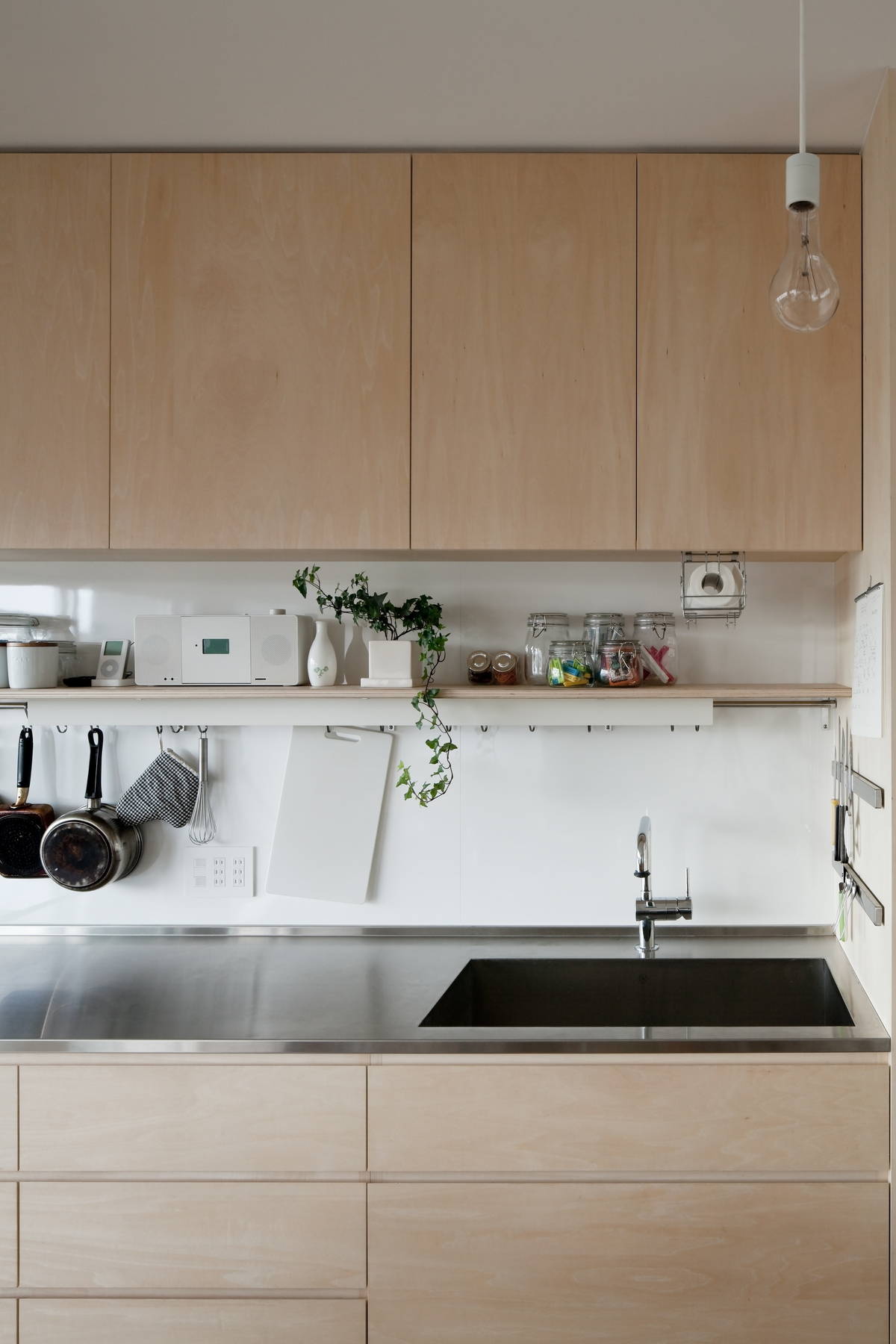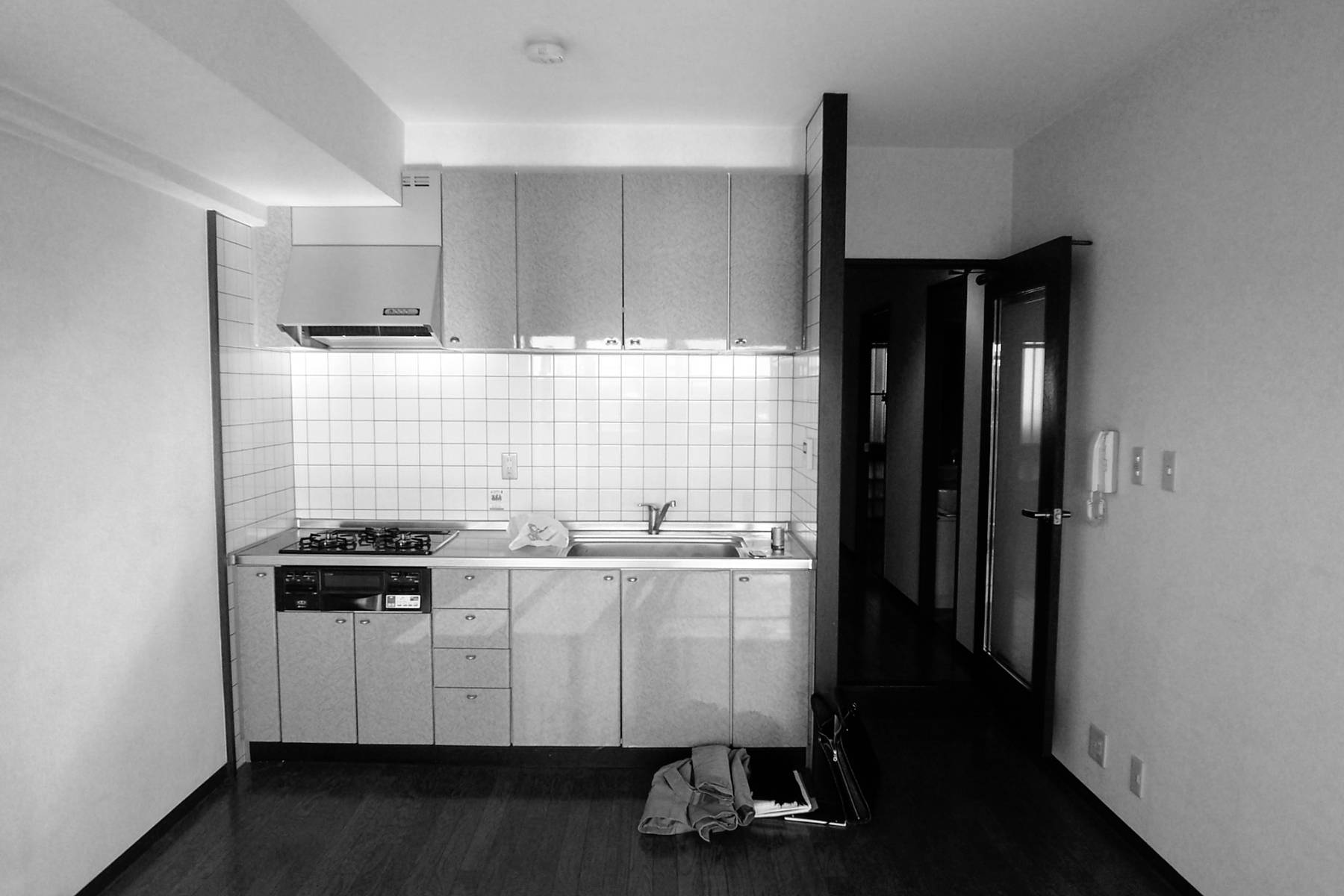若いご家族のためのシンプルなマンションリノベーションです。一般的に中古マンションは流通上の効果を期待して必要以上に部屋を細分化し、室数を水増しする傾向があります。今回のマンションも形式的には一応3LDKではあるもののLDKはダイニングテーブルを置くのが精いっぱい、生活の中心となるスペースが無い状態でした。限られた予算とスペースの中で充分な生活空間を確保するため、天井や不要な間仕切りを取り払って大きなLDKをつくり、必要最小限のキッチンと多目的な可動棚のみを合板で製作しました。肌触りの良い無垢フローリングの上で半椅子座・半床座の気取らない生活を送ることができます。