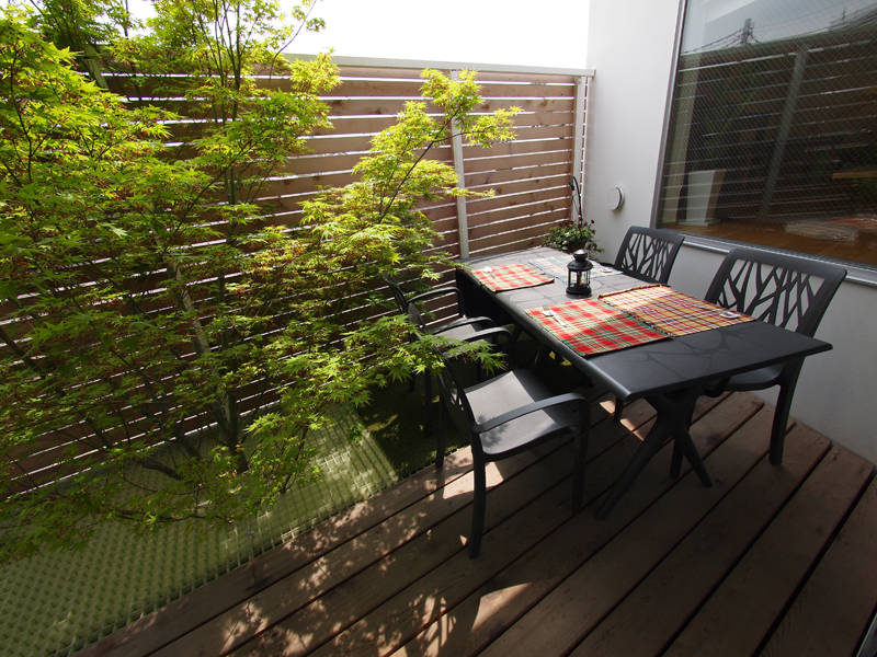庭とリビングルームにシンボルツリー バルコニーを貫くヤマ...