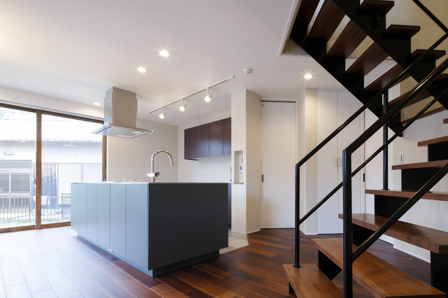 充分すぎる程の広い敷地を活かし、日当たりは勿論の事、仕事で忙しい日々に追われるオーナーが休日にリラックスした時間を感じられる様に庭との繋がりも意識して間取りを構成した。周りの床より1段低くしたサンクンリビングは心理的な落着きを与え、大きなテラス窓からはデッキと緑の芝が広がり、内と外の空間をあいまいに繋いでくれる。