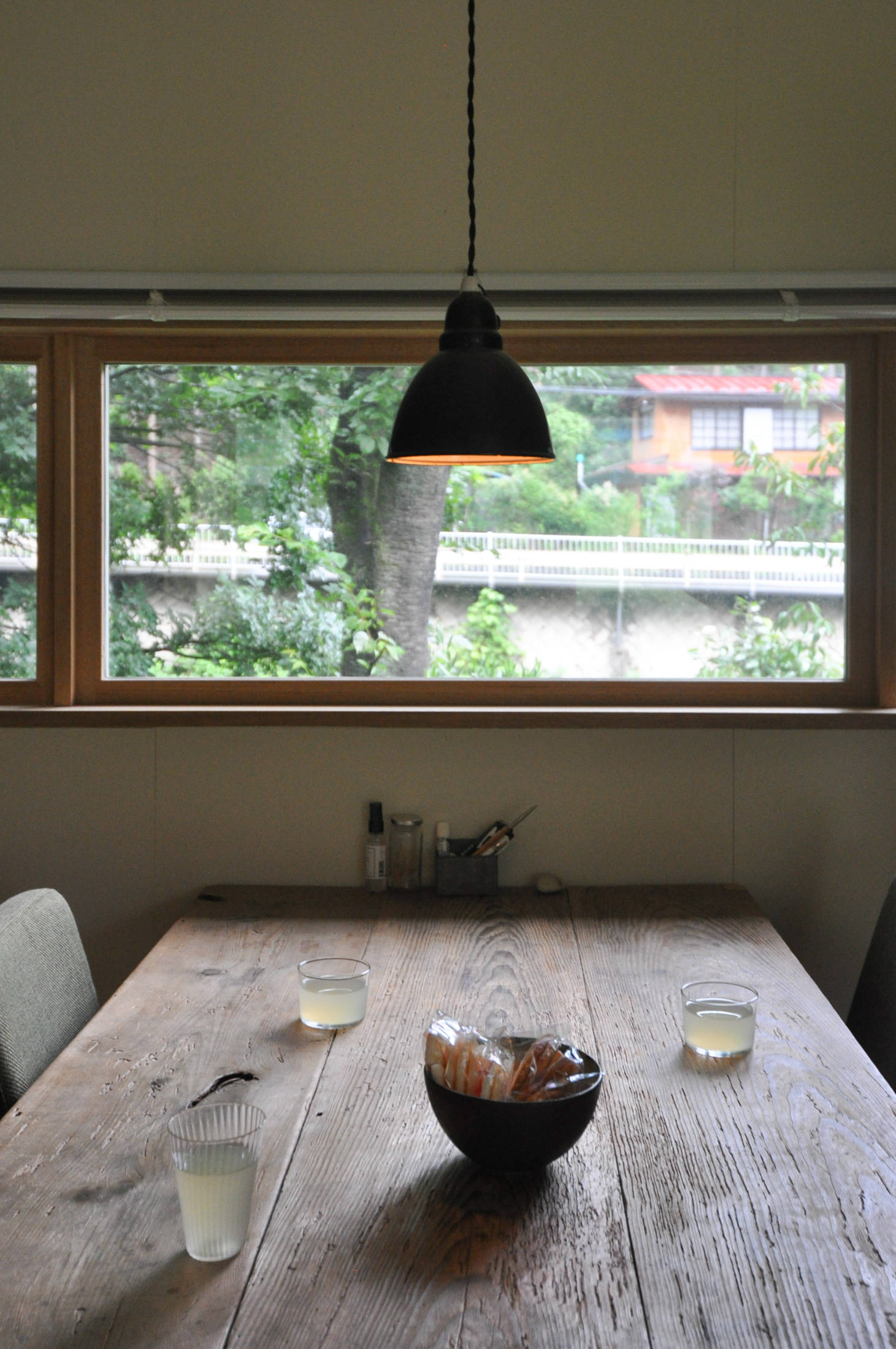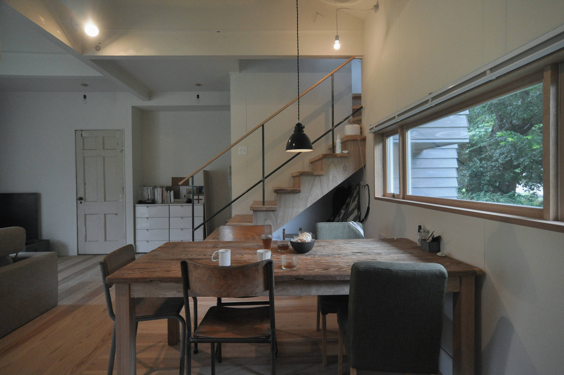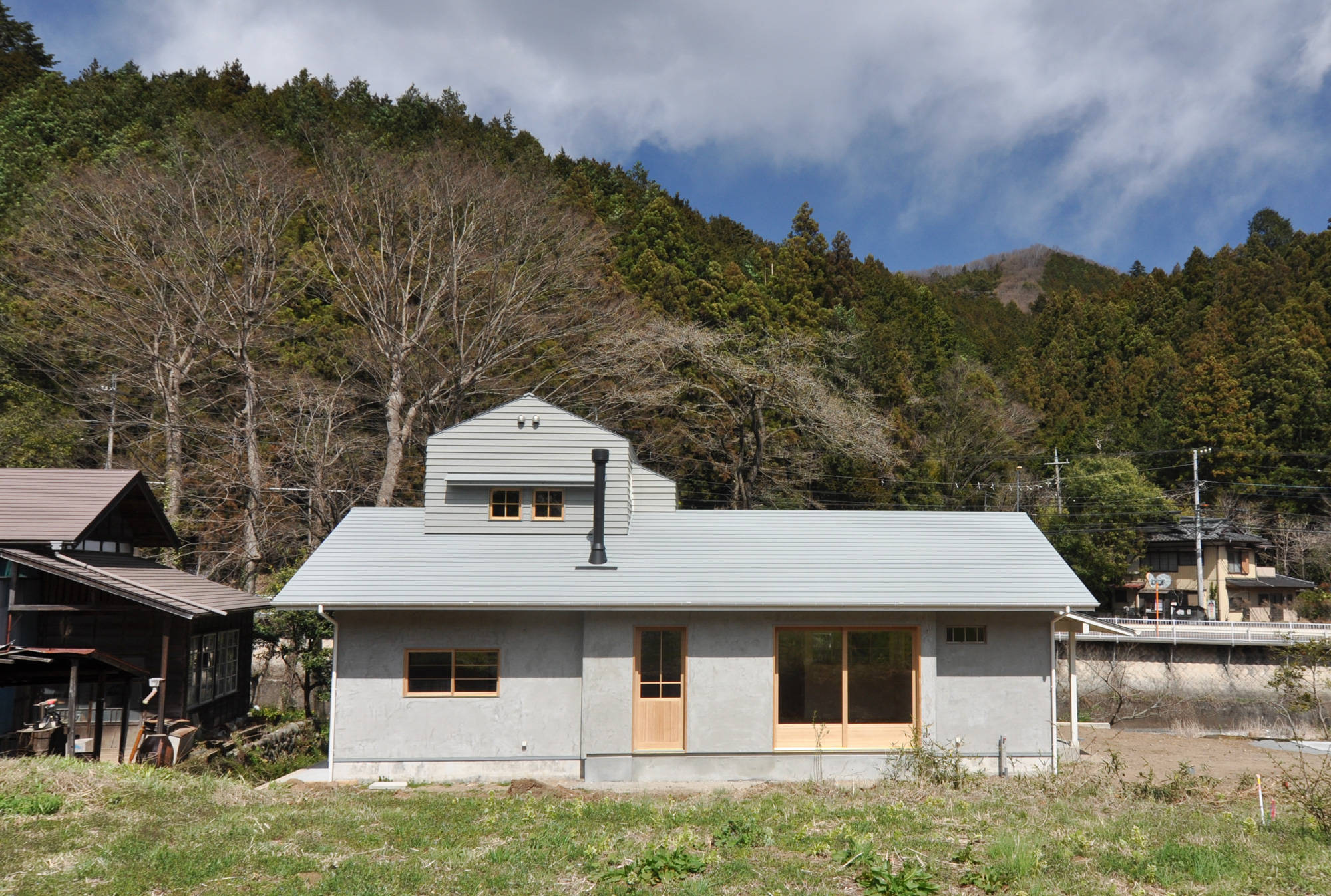 飯能市西吾野の高麗川沿いに建つ住宅です。山並みや高麗川を借景にしたローカルサイドの暮らし。お客さんから支給された中古の柱、梁材、アンティーク建具や照明を中心に、ペンキ仕上げの壁と杉板の無垢フローリングで仕上げたシンプルな住宅です。(埼玉県飯能市 Y邸)