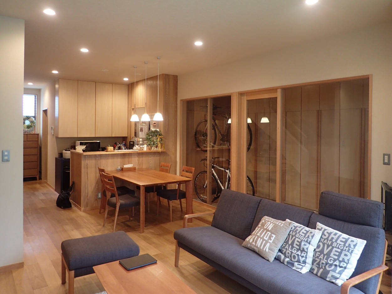 リビングと接している反対側は、壁すべてがガラスのスクリーンになっていて、リビングと一体化した空間を作り出しています。リビングに入る小さな框の向こうにも、かなりのスペースがあったので、計画時にお客さんと相談して、ロードバイクを縦に2台吊すことができるように考えました。ちょうどリビングのダイニングスペースからそのロードバイクを眺めることができるようにもなりますし・・・。