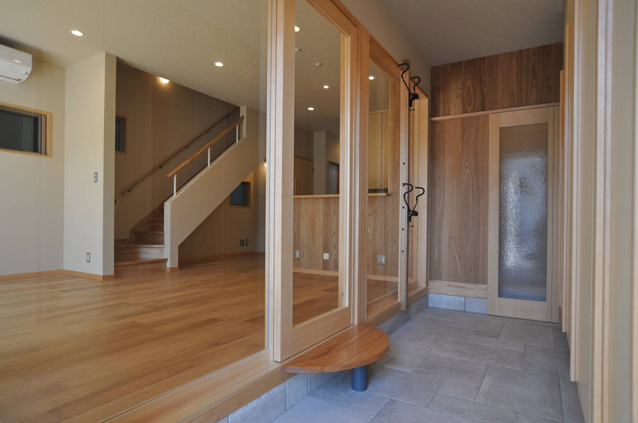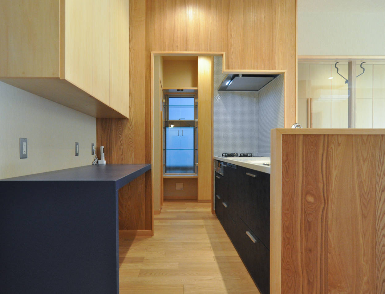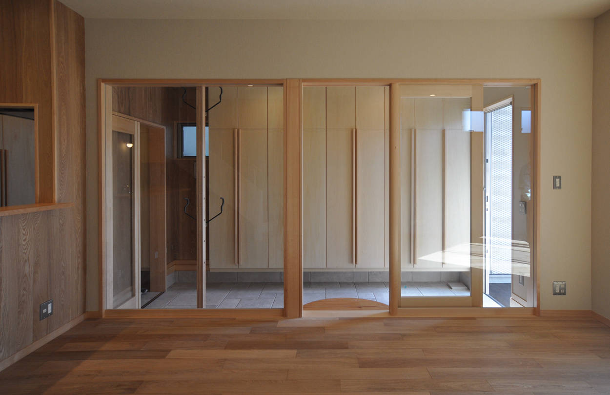 玄関の扉を開けると細長い土間玄関が奥へと続いているのが、この家の最大の特徴です。奥のガラス戸の向こうはキッチンスペースになっていて、リビングを経由せずに、直接キッチンに行くことが出来る工夫です。その奥行きのある土間の長い東側(右)の壁面は扉のある収納スペース。奥行き400mmの物入れで、靴はもちろん、日常の小物や買い物のストックはここに収納できるようになっています。