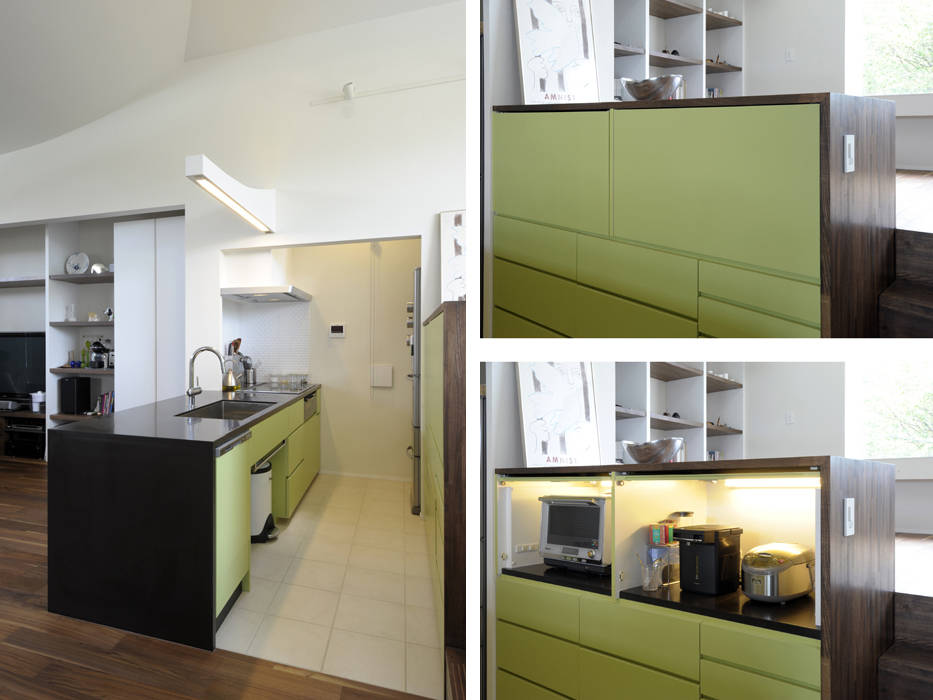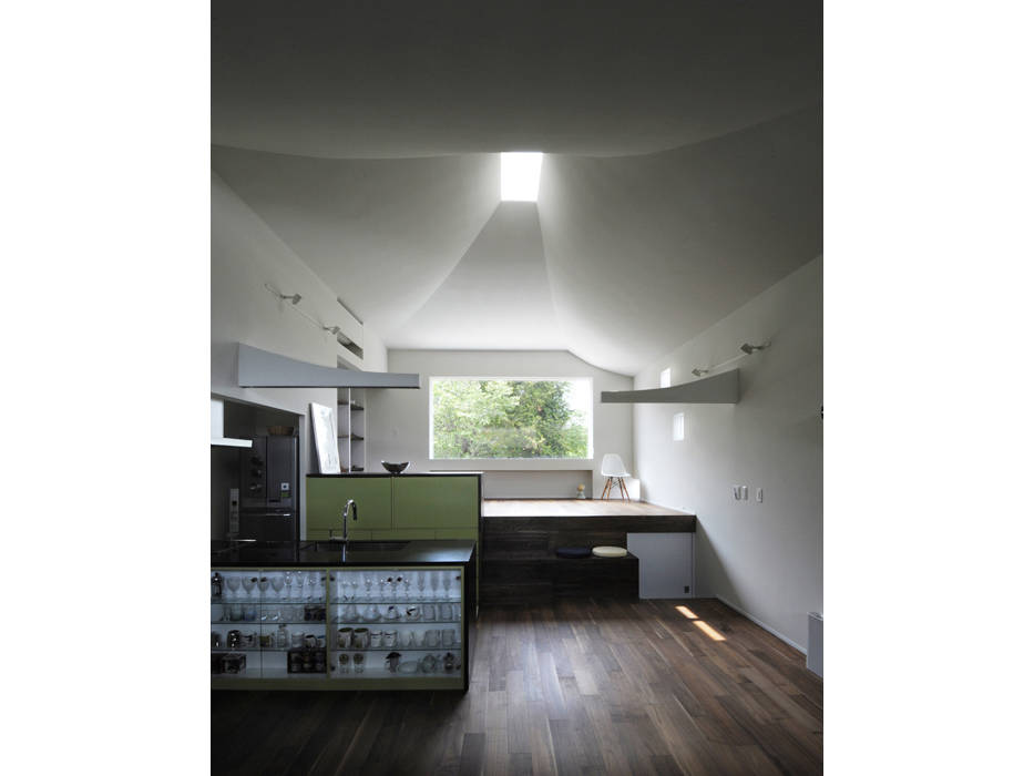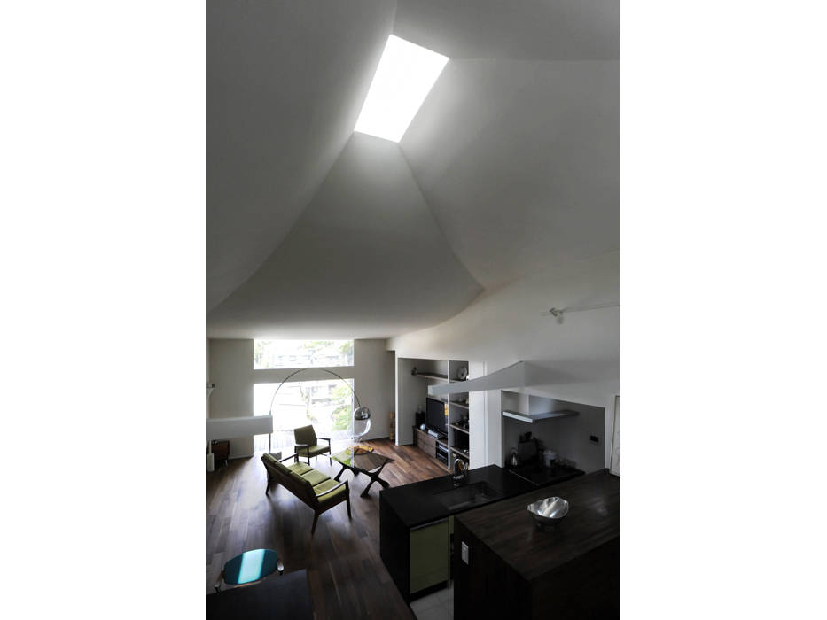 雲の間から光が差し込むLDK 東西方向に奥行きの深い、北向きの急斜面に造成された敷地のため、南側からの採光が得られず、建物の中心部分に日照が届かないことが予測できました。 そこで、2階をワンルームのLDKとして、天井の真ん中に天窓を設けました。 さらに、天窓からの光を雲間から差す一筋の光線と見立て、背景となる雲のような天井のかたちをデザインしました。
