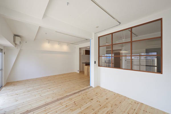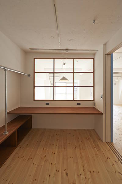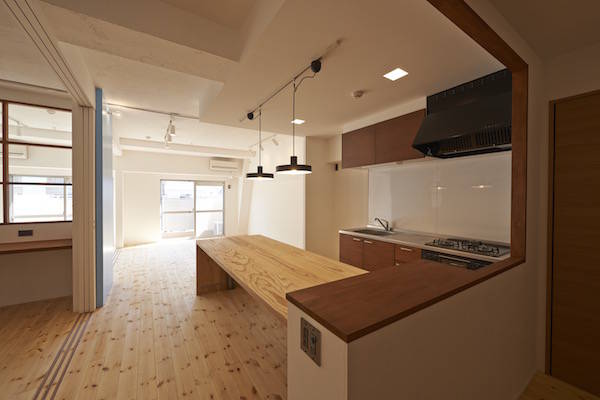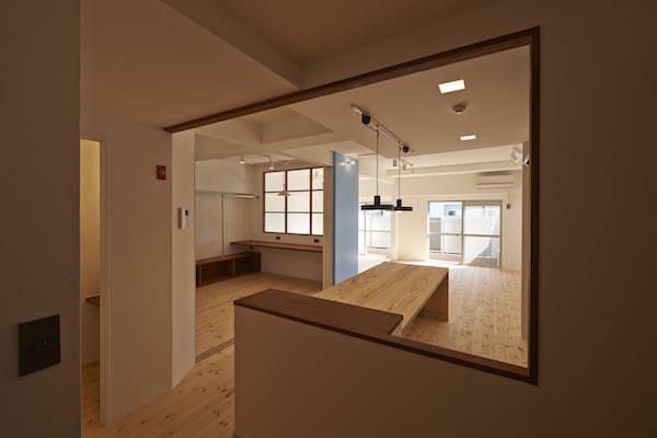 既存間仕切りを解体し大きなワンルームとし、家族全員が楽しく暮らせる場所を作るということを考えました。部屋の中心には3メートル近くある大きなテーブルがあります。また、黒板塗料を塗った青い壁、両親や友人が泊まりに来た時に間仕切ることが出来る可動式壁など、楽しい仕掛けがいっぱいの家です。