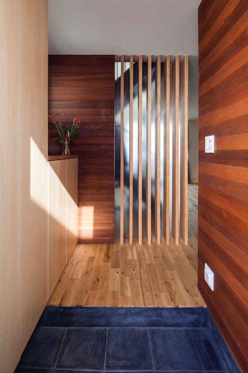住宅密集地にありながら、南側に隣地と共有の敷地延長部分があり、将来的にも建物が建つことがないことから大型の可動フェンスにて道路と仕切り、他人の侵入のない路地空間を庭代わりとした。そこにLDKが面する、2階は日当たりのよい場所にバルコニーを設けて外部とプライベート空間との緩衝地帯とした。