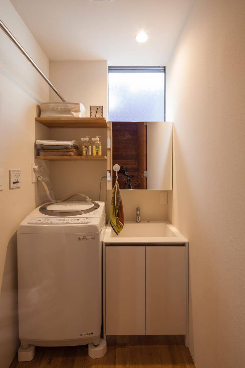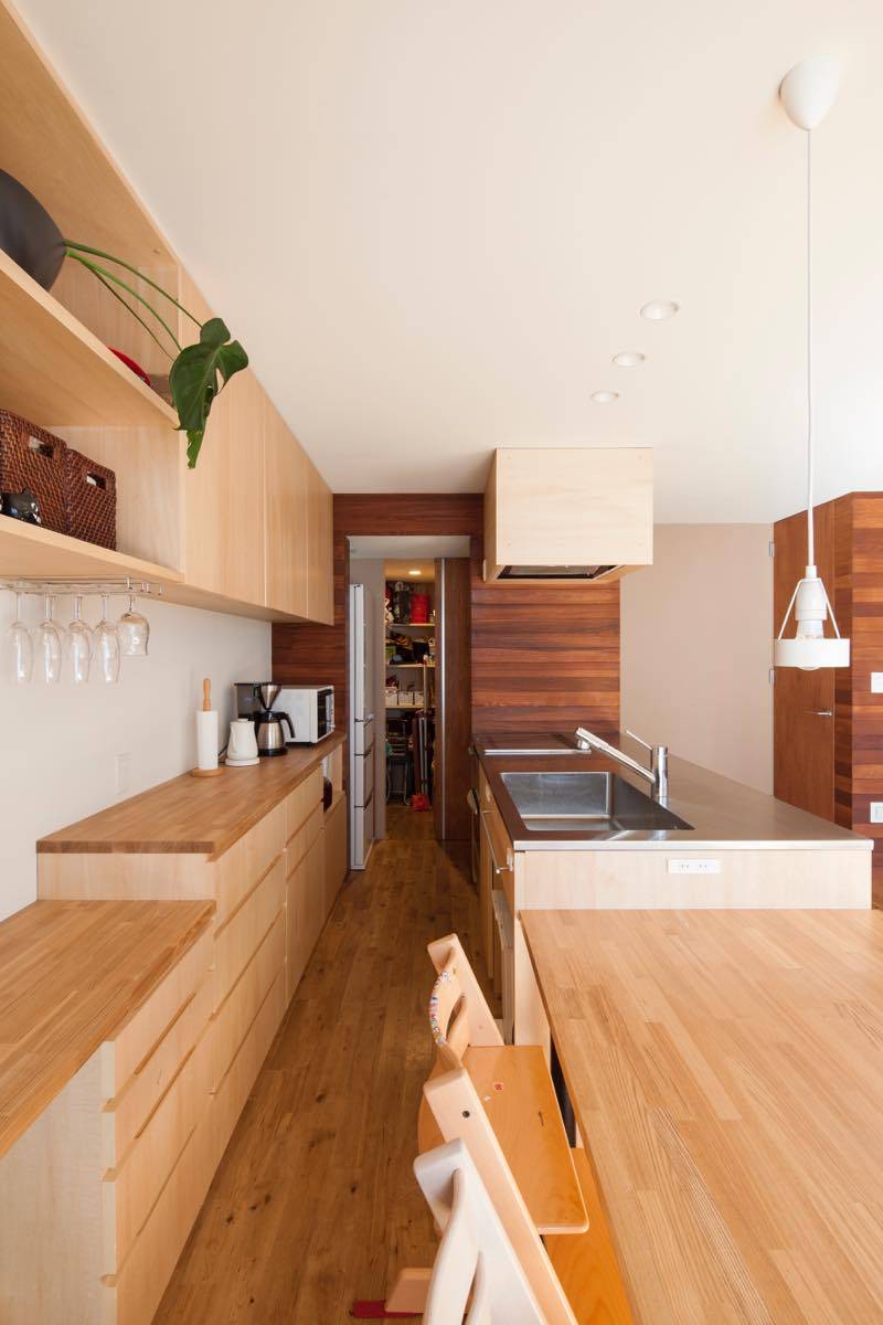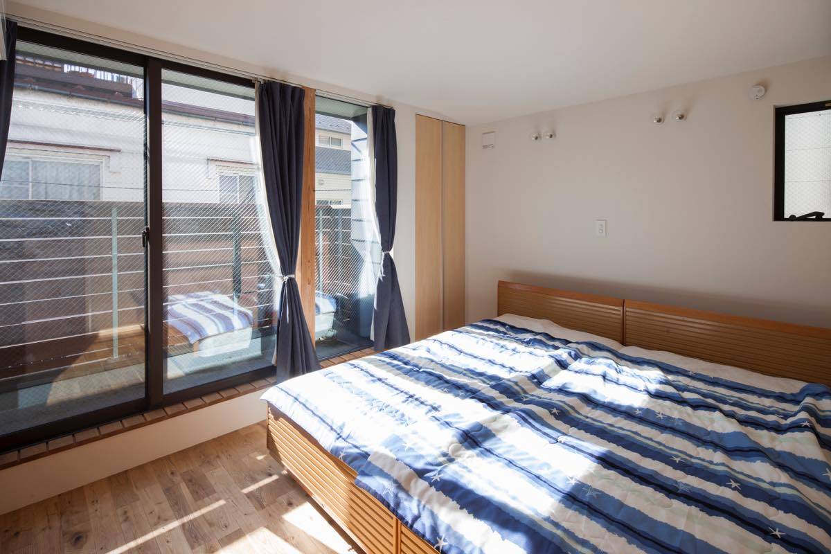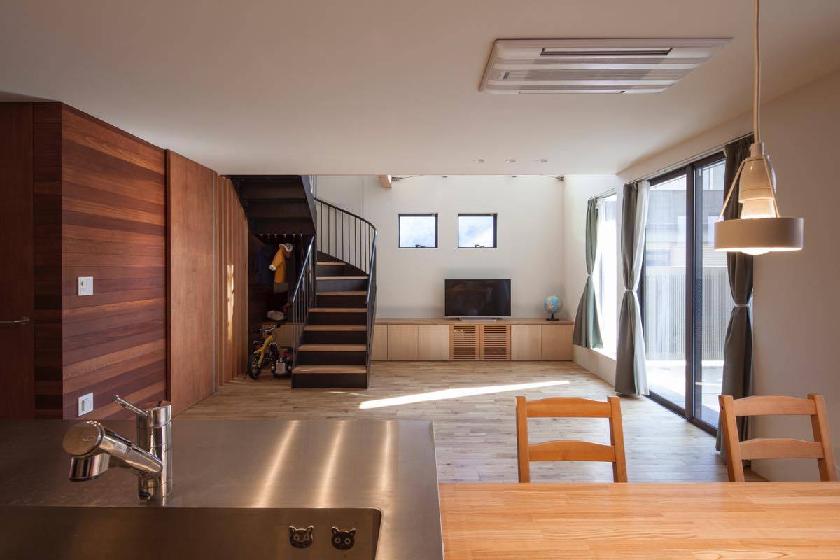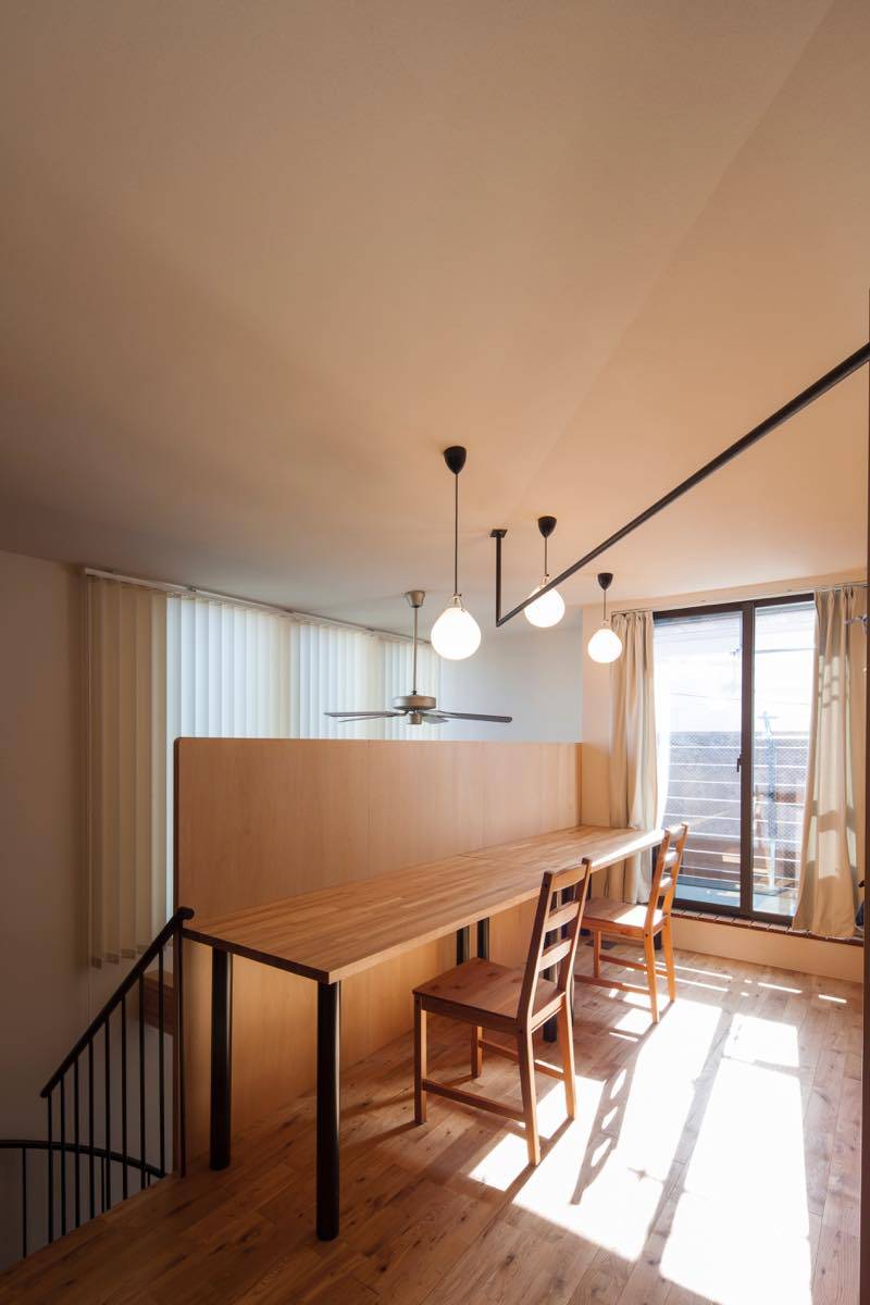 また、わずかに開く東側道路からの採光や期待して、吹き抜けを設けて道ゆく第三者の視線は遮りながら朝の光を取り込みながら、道路の様子もそれとなくかがうことができる。