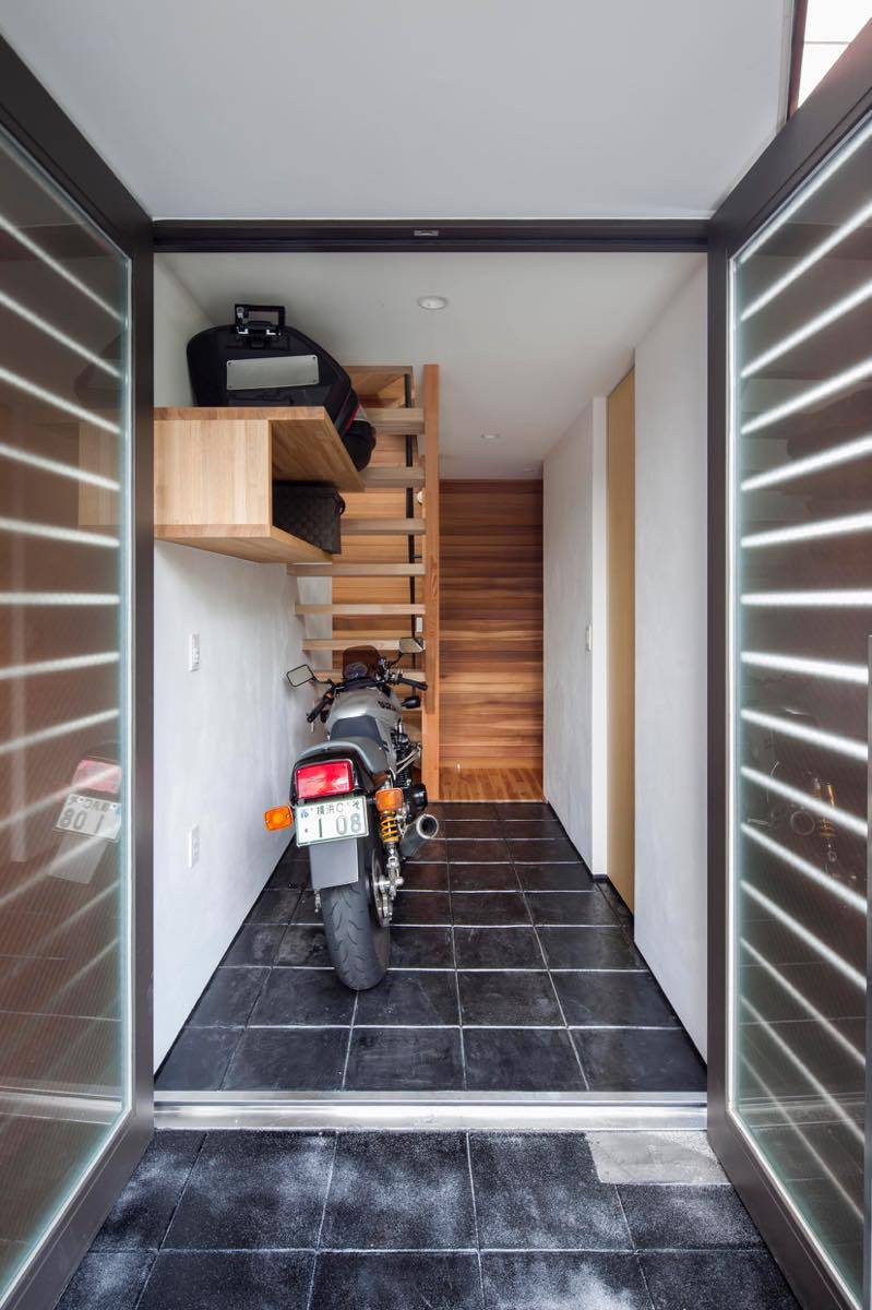 1階はほとんど眺望が期待できないため、バイク置場を兼ねた玄関と書斎兼客間 、夫婦の寝室と水廻を設けた。書斎からはわずかに六本木ヒルズが見える。設 備的には燃料電池による自家発電設備(エネファーム)と床暖房を備え、特注 キッチンの夢も実現することができた。