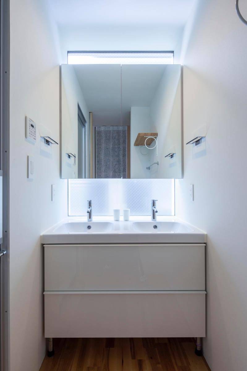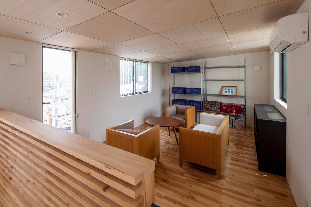 北側に面する隣地が一段低いため、3階からは隣地アパートの屋根越しに眺望 が開けており、ここに北側斜線制限をよけるかたちでセットバックした部分に 眺望デッキを設けた。3階はしきりのないワンルームとし、当面はセカンドリビングやプレイルームとして利用し、将来的には間仕切りを加えて子ども室となる。