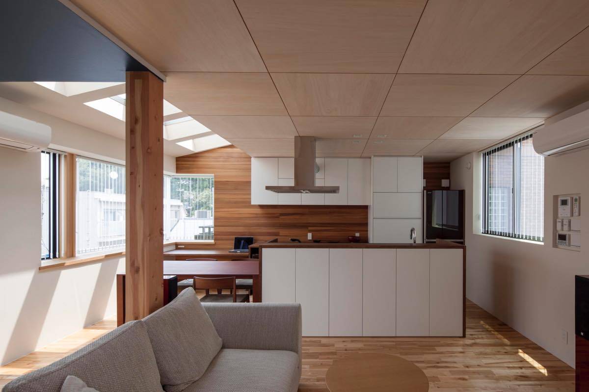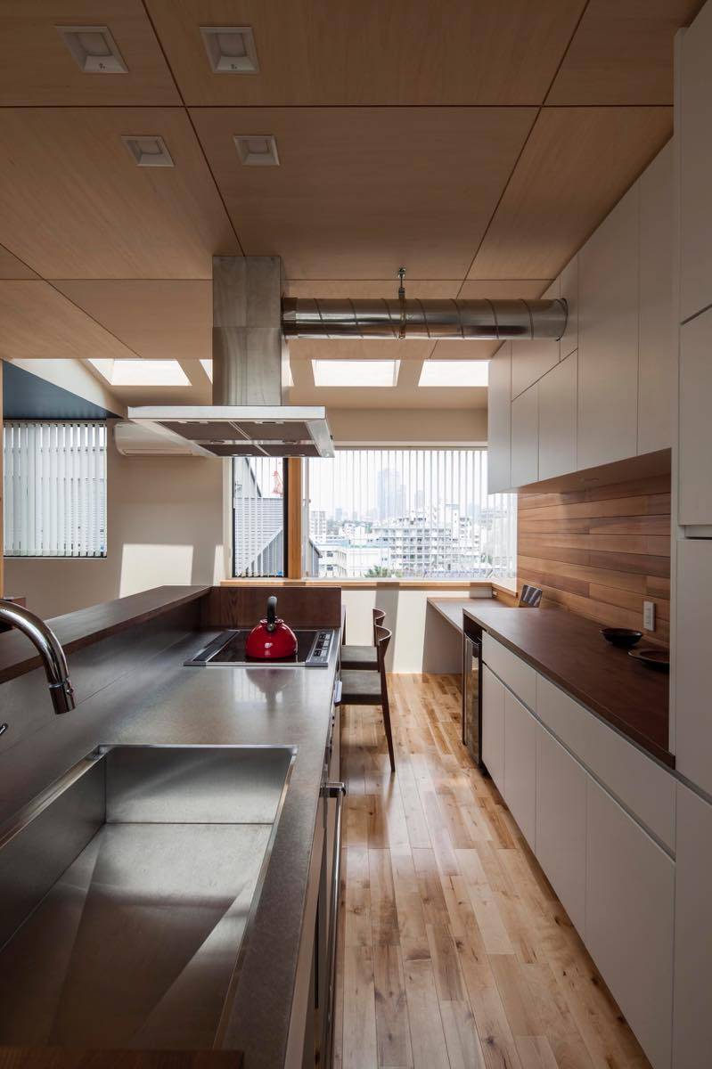 中間層である2階にLDKを配置し、建物の間から眺望が得られる場所を狙ってL 型の出窓を設け、ダイニングキッチンとワークデスク、たたみコーナーを置い た。3階セットバック部分の屋根面にトップライトを設け、北側とはいえ安定し た明るさと開放感が得られる。 旗竿状の敷地形状であり、南側の敷地延長部分に面する開口部から陽当たりを 期待した。この位置に吹抜けを設け、リビング、そしてスケルトン階段を通じ て1階にまで光を落とすとともに、2階LDKと3階のセカンドリビングと空間的 な繋がりをもたらす。