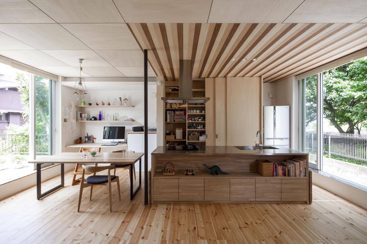 また共にクリエーターであるクライアント夫婦の要望を受け、家の 様々な状況に応じて使えるワークスペースを複数の場所に分散して 設けた。固定の造付ワークデスクとしてはキッチン脇と階段踊り場 に設け、さらにソファやダイニングテーブルでもノートPCを使って リラックスしながら軽い仕事ができるようにと考えた。