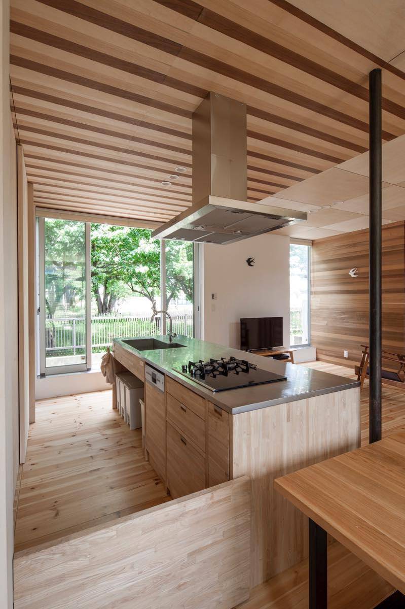 北側の緑地を活かし南庭と両方に面して大きな開口部をもったLDK を1階に配置。のびのびと子育てができ、桜や梅の花など、四季を 楽しむことが出来る家を提案した。