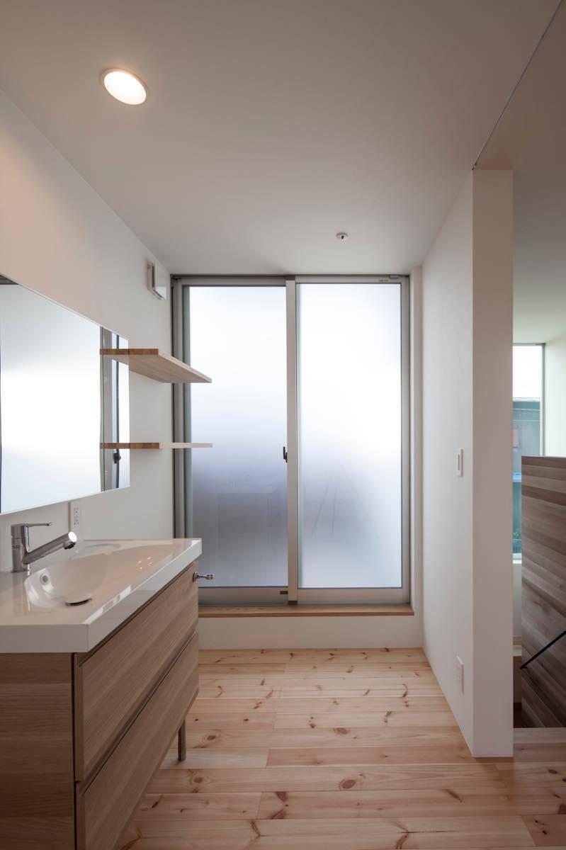 階段は蹴上を低くし踊り場を設け、昇りやすく安全な作りとした。 設置面積としては増えたが、視覚的にも実質的にも面積効率が良く なる様に階段下部分では中央手摺壁で玄関とLDKを間仕切り、階段 端部をスチールで吊ることで落下防止柵にもなりつつ、視線が抜け ることで、スッキリと開放的な印象を与える玄関側の段板端部の仕 切りはポリカーボネート板とし、光を透過して行灯の様に照らす。 吊材のスチールは黒染色仕上げとしラフな鉄の質感を残した。