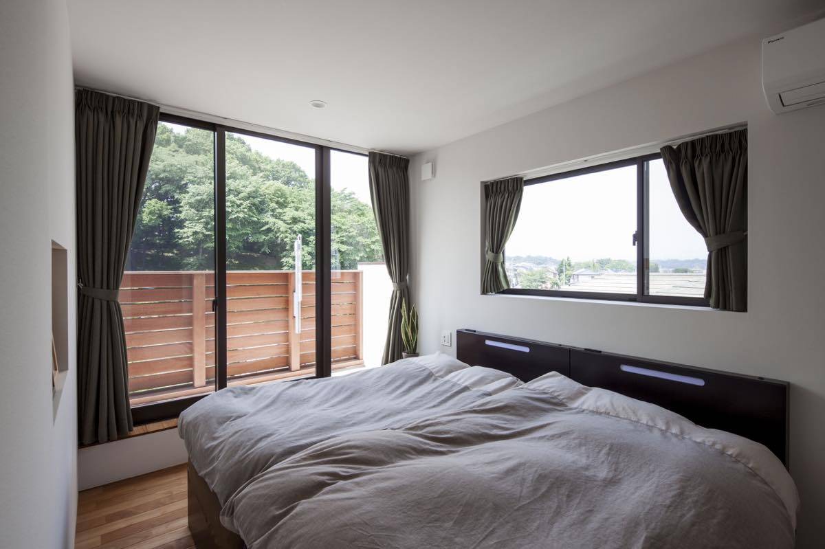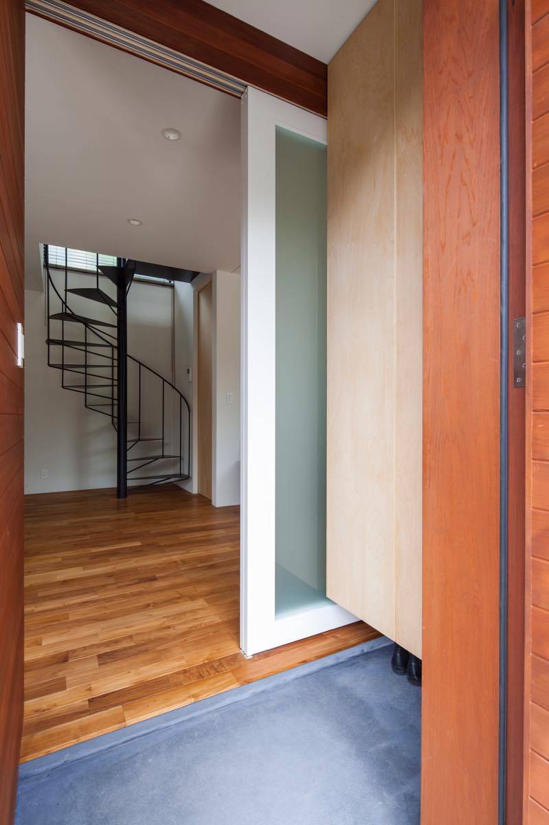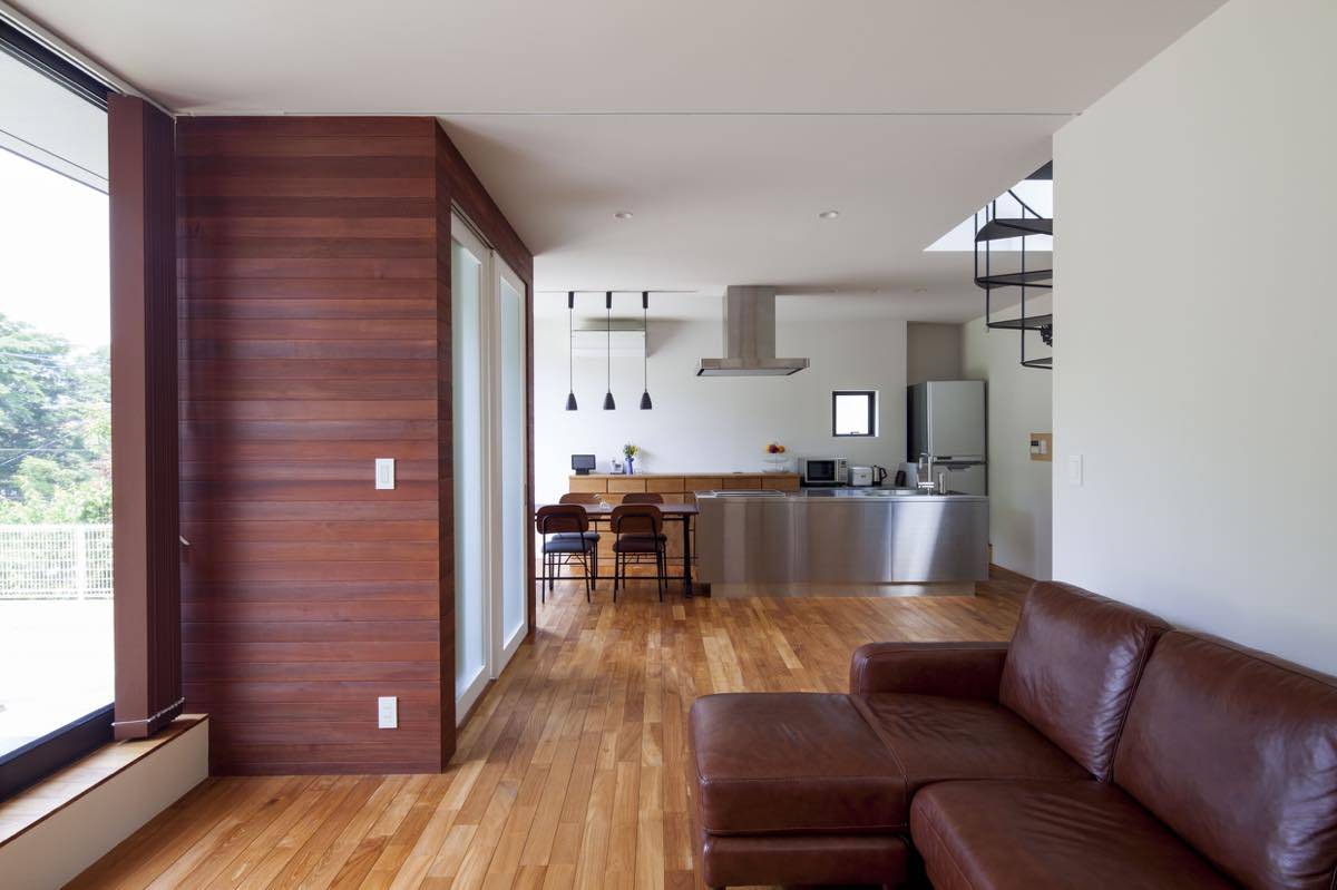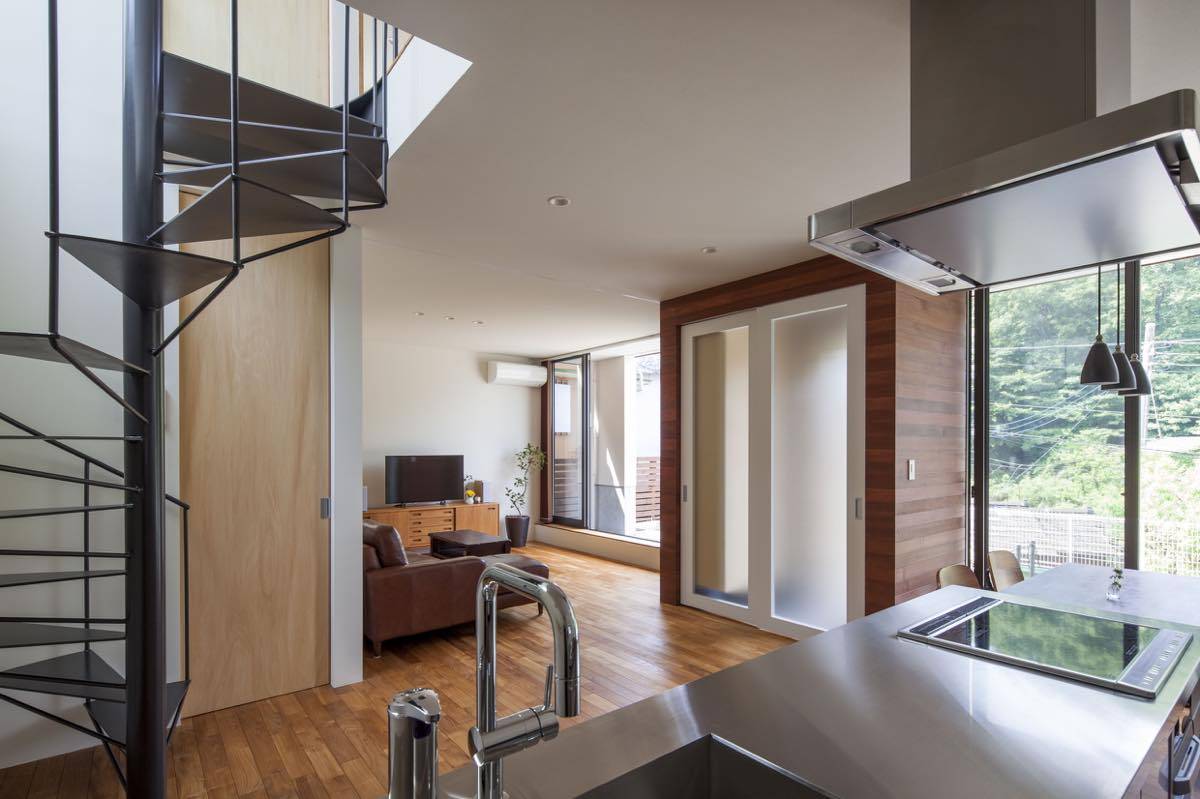 郊外の見晴らしの良い高台にあり、南側に対して広く視界が抜けて目の 前に山林の景色が広がる。ここにまるで別荘地にでもいるかのような 気分で過ごす事ができる家を計画した。 高低差があって庭が広く取れることから十分な開放感とプライバシーが 期待できるため、1階に開放的なLDKを配置した。 リビングは間仕切ることで客間を兼 ね、遠い将来には老後の寝室としても 利用可能。北側は古い隣地擁壁が崩壊したときの防土堤を兼ねた高基礎を 天井付近まで設けたため有効な窓が設置できず、 螺旋階段の吹抜け部分を介して光と風を採りいれる。