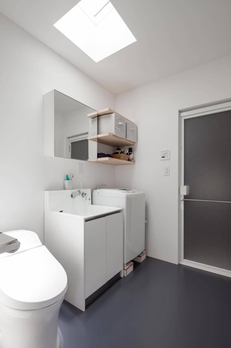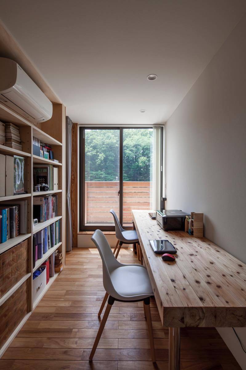 2階には個室と廊下を兼用した共用のワークスペースを配置。 個室から南側の眺望はもちろん、さらに朝夕の光や隣家の屋根越しに 八王子市内や遠くの山々の景色まで望むことができる。 高低差のある敷地において、既存古家解体や既存RC半地下車庫、 複数の既存擁壁、職人不足や建設費高騰などの難しい条件であったが、 土地取得コスト、改修新築コストとも様々な工夫で抑えた。