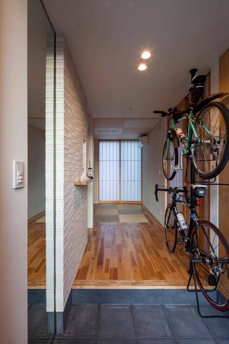 1はアプローチ階段を昇り、玄関の内側と外側の接続の場として家族や来客、 荷物の出し入れや溜まりのスペースとしてだけでなく、心理的な内外の境界としての効果にも期待した。
