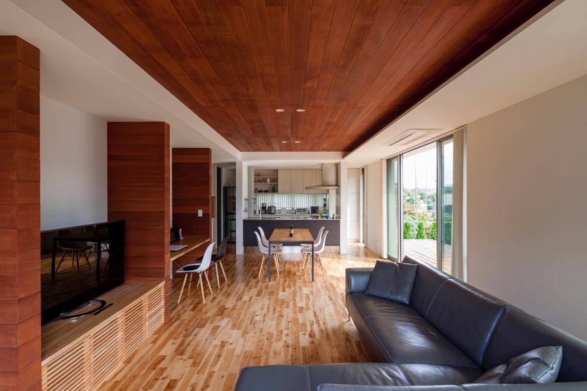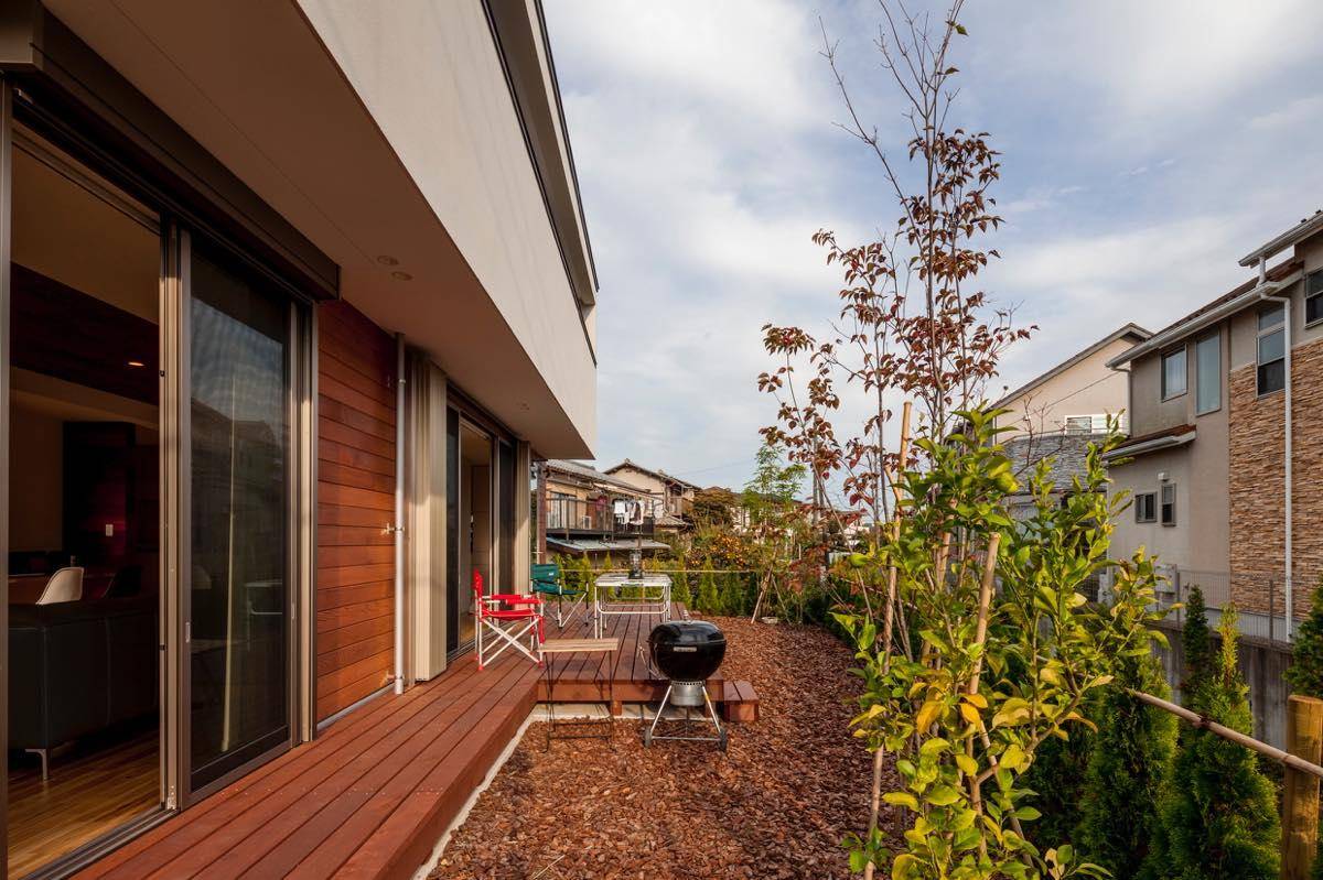 ここにアウトドア好きの家族より、自然を感じる家にしたい、との要望を受けた。立地条件から、開放感を得ながらもプラバシーにも配慮した家にすべく、 次の5つのデッキやテラスを設け、これらを外部とのバッファゾーンとすることを試みた。