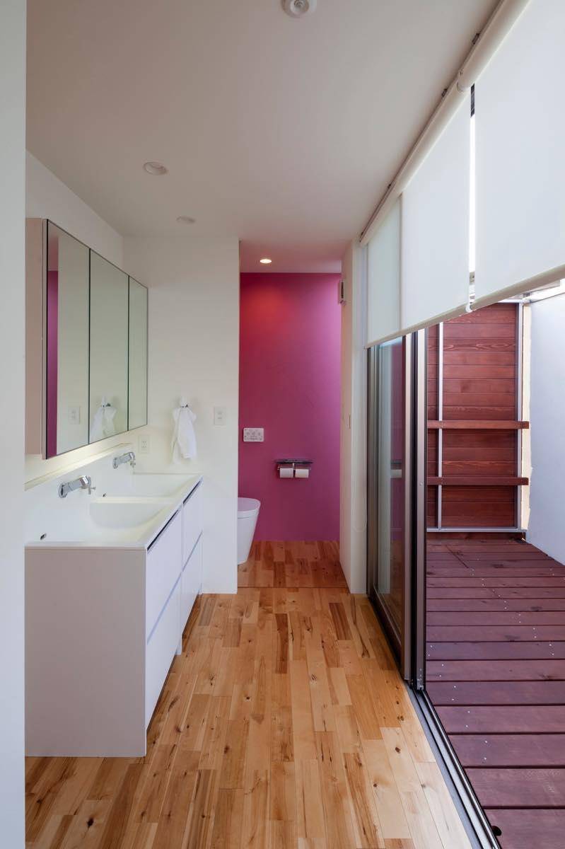 4、5については、2階にあり個室やバスルームに面するため、それぞれ腰壁、 2.2mの目隠し壁によってプライバシーを守りながら光や風、開放感といった外 部的な要素を室内に取り込む。バスコートは眺めるだけでは無く、風呂上がり の一杯も楽しみむことができる。