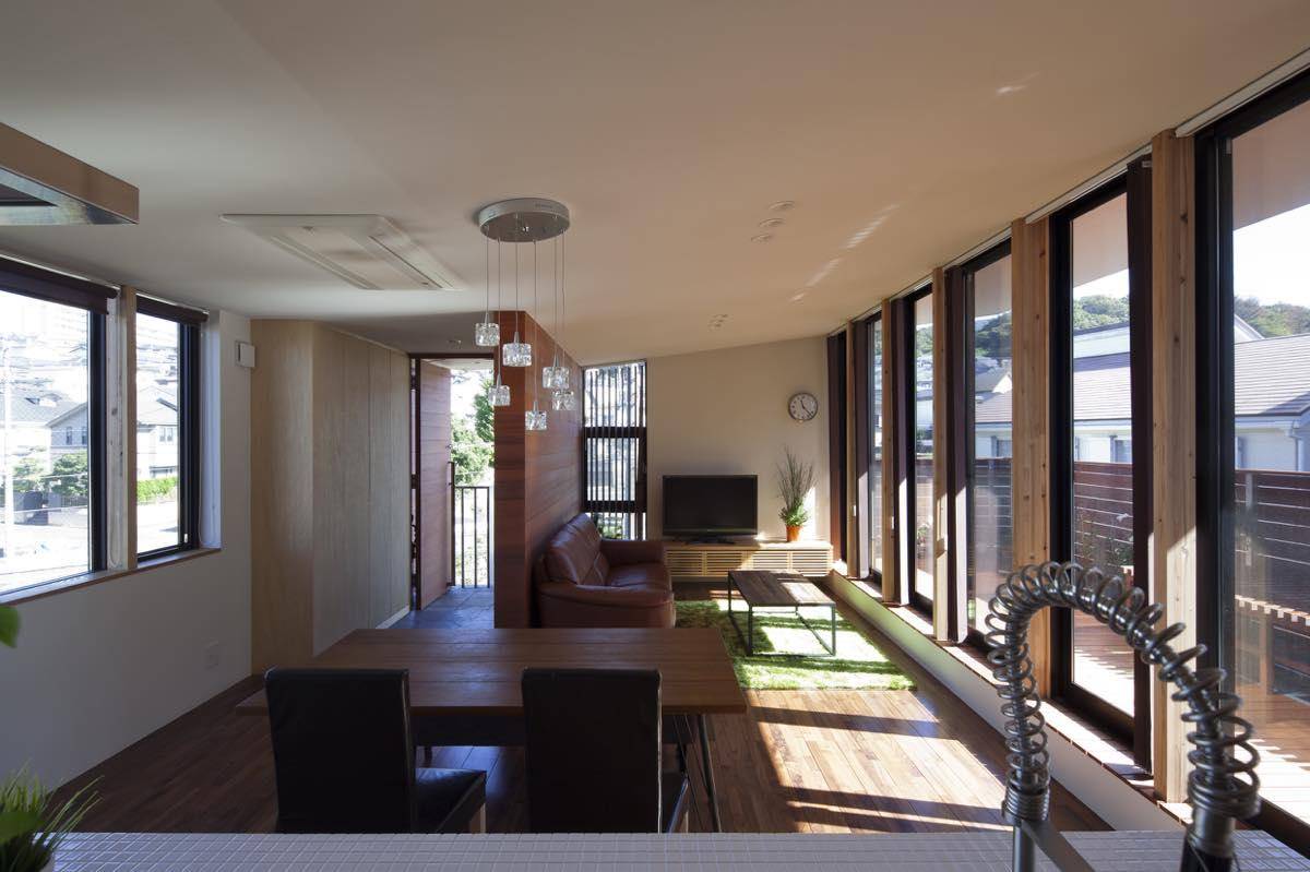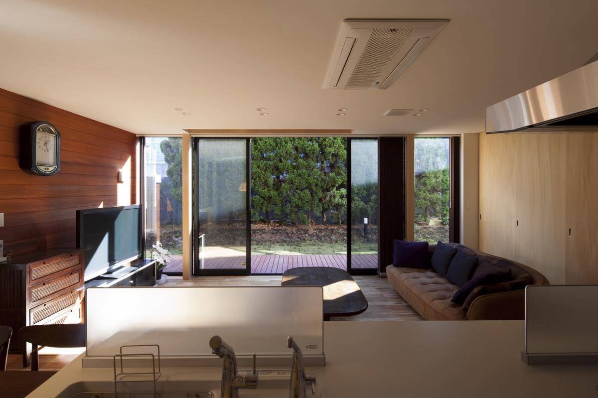 1階は親世帯。レベル差を少なくし、LDKとつながる庭と廊下を兼ね たギャラリーを持つ。2階はわんぱく盛りの子どもがいる子世帯。庭代わりの広いデッキを持ち、高台のメリットを活かした眺望を得る。