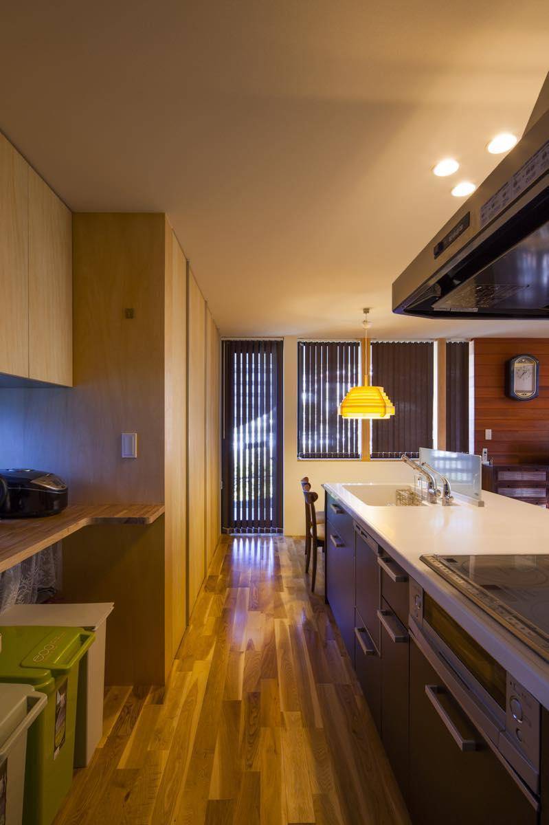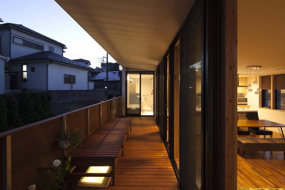 2階デッキには階下にある親世帯リビングに光を落とすトップライトを設けた。これは夜になると、逆に1階の親世帯リビングのあかりがもれて、2階デッキのガーデンライトとなる。 このあかりが消えれば、就寝の合図。子ども達に「おじいちゃんもおばあちゃんも寝たから静かにしようね」と下階への配慮を促すことができる。