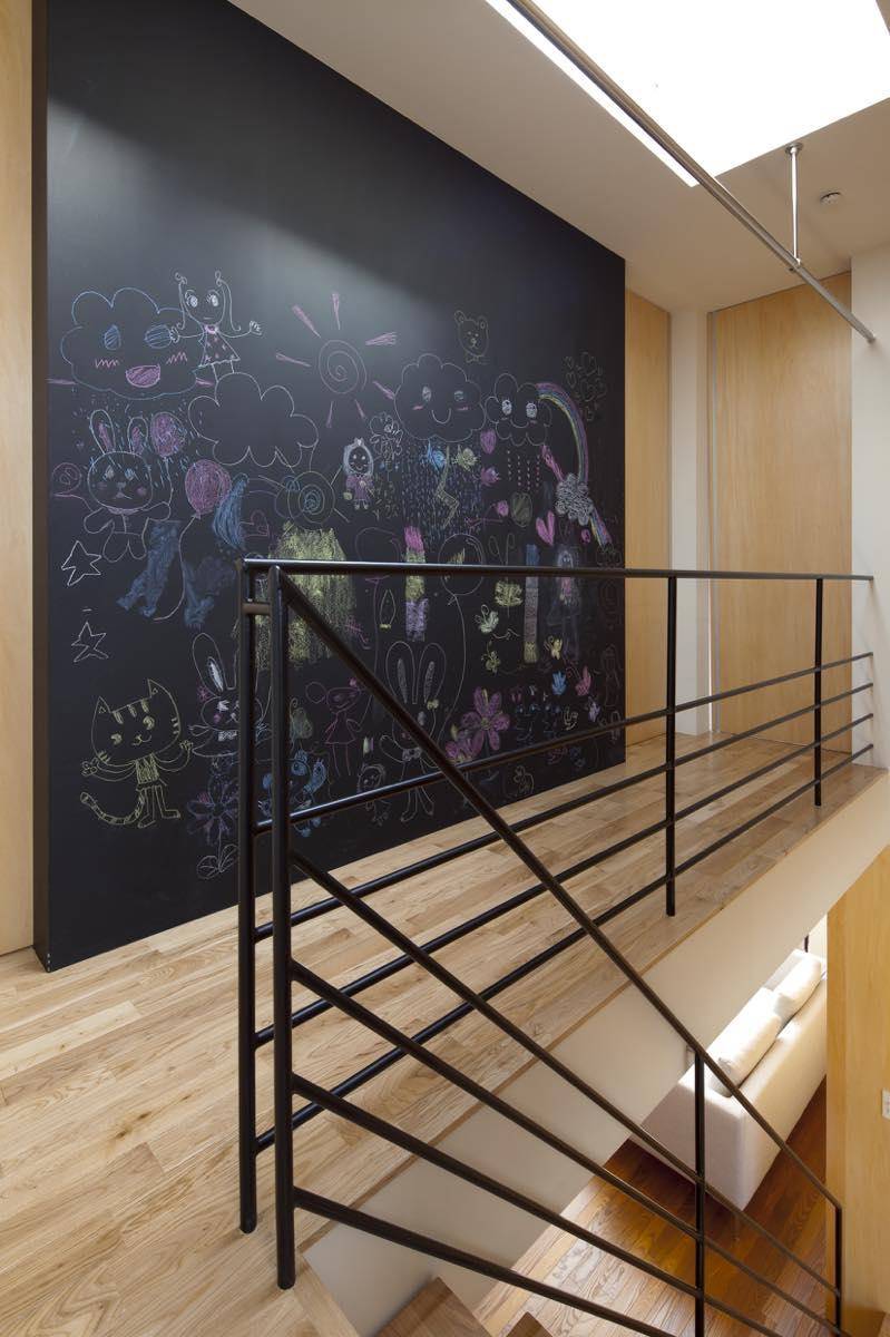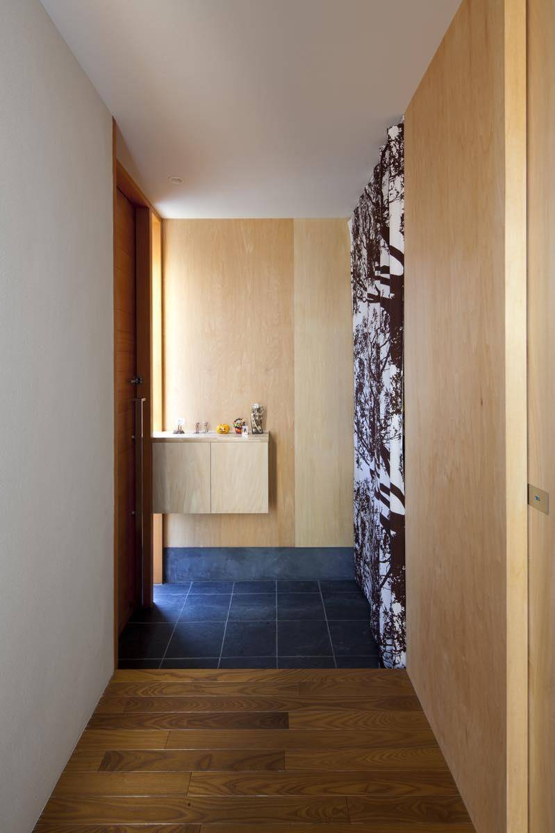2階には個室とバスルームなどの水廻りを配置した。階段上部のトップライトは廊下と中階段を明るく照らし、1階にも光を届ける。ここは室内の物干し場でもあり、廊下壁面を黒板にすることで子どもの遊び場も兼ねる。個室は吹抜けを介してつながる。広いほうの個室を当面は家族の主寝室として使い、いずれは子ども室として2室に分割する。その場合には現在の書斎を主寝室とする。主寝室を時期によって移動することからクローゼットは洗面脱衣と直接行き来ができ、将来の主寝室ともつながるように配置し、どの時期でも使い勝手がよいようにと配慮した。 このように、子どもの成長過程と共に、若い家族の将来のライフスタイルの変化に柔軟に対応できるように工夫した。