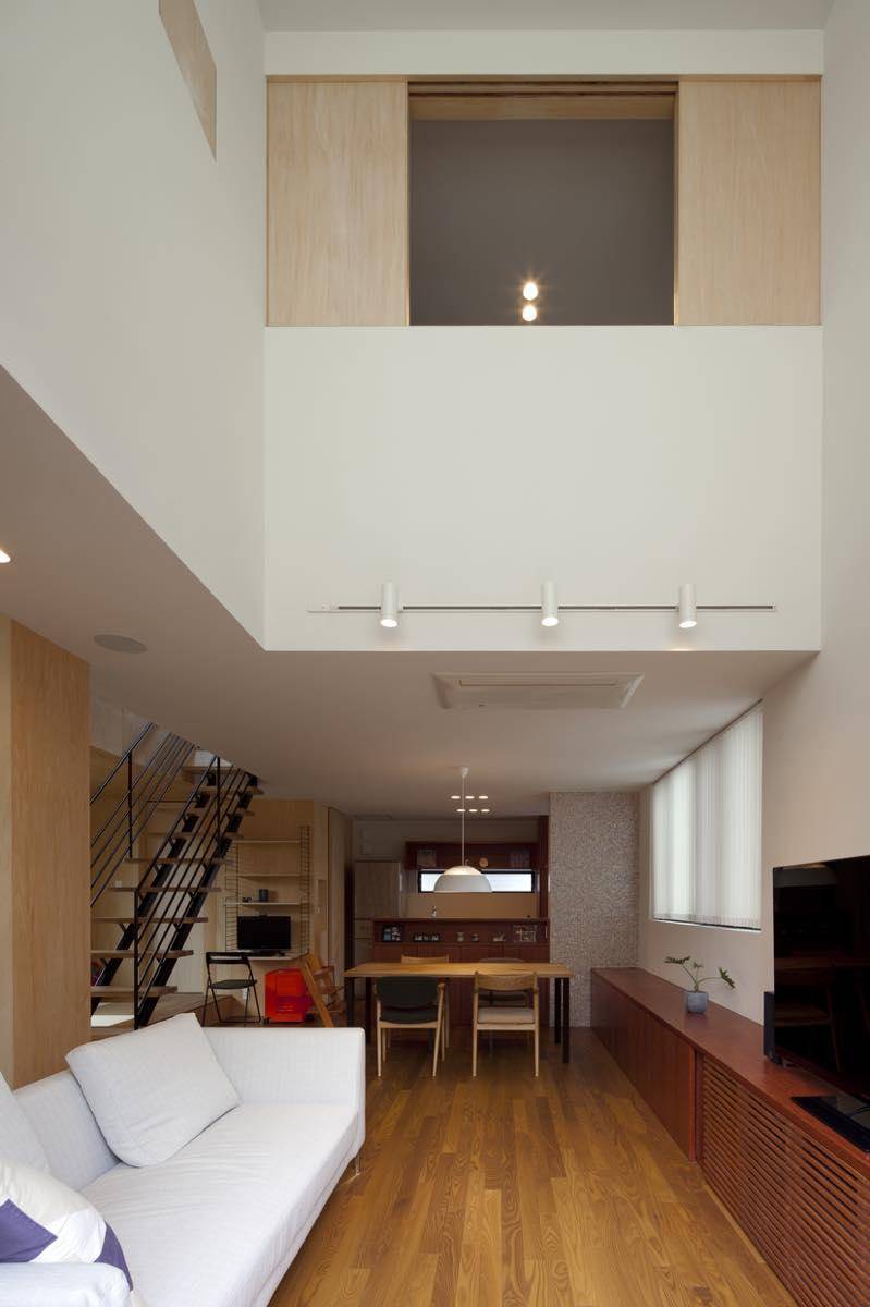 1階のリビングは、南面のあえて一段高さをあげたデッキによって前面道路や向いの家からの支線からプライバシーを守りながら、落ち着きと開放感を得る。上部に設けた吹抜ハイサイドライトからは空を眺めることができ、面積以上の開放感を得ると同時に、奥に長く配置されたダイニングキッチン側にも充分な採光を確保する。隣接した和室コーナーは普段は可動間仕切りを開け放ち、鉄骨造のスケルトン階段越しに視覚的にLDKとつながって、広く一体的に使うことを想定している。小さな子どもを寝かしつけたり、遊び場として活躍する。併設したWICは来客用の寝具以外にも、おもちゃを片付けたりするリビング収納も兼用している。