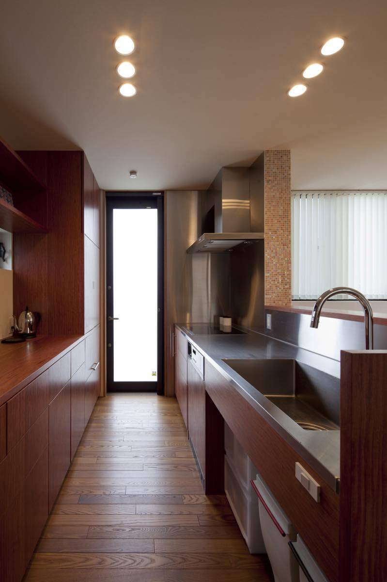 来客が多く、2台の駐車を望んだが、敷地の大きさと家の配置から容易ではなかった。 そこで高低差を利用して擁壁と基礎の躯体を兼用させて、道路側の空きスペースを効率よく確保した。そこにアプローチと連続するウッドデッキを設けて、下部の地下スペースを屋根付き駐輪場と頭入れの部分的な駐車スペース、物置として利用することで、来客時には先に自家用車を縦列駐車しておくことで合計2台分の駐車スペースを実現した。