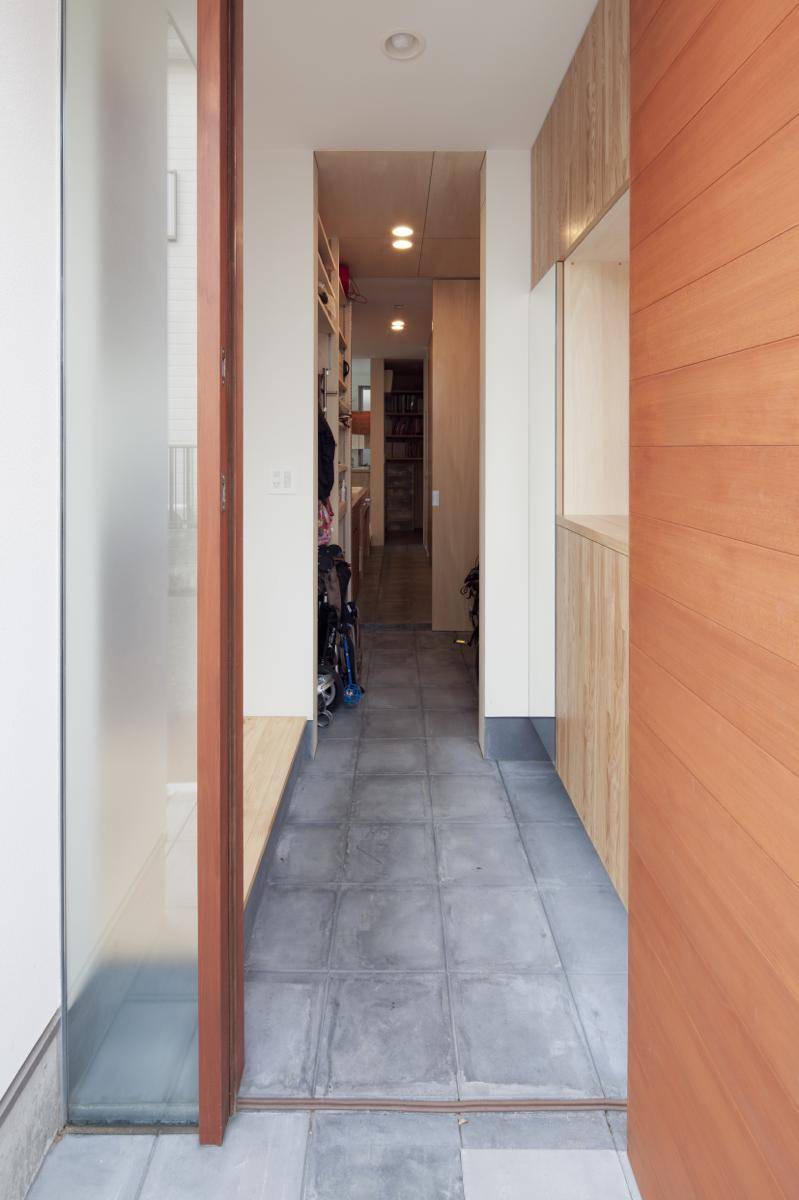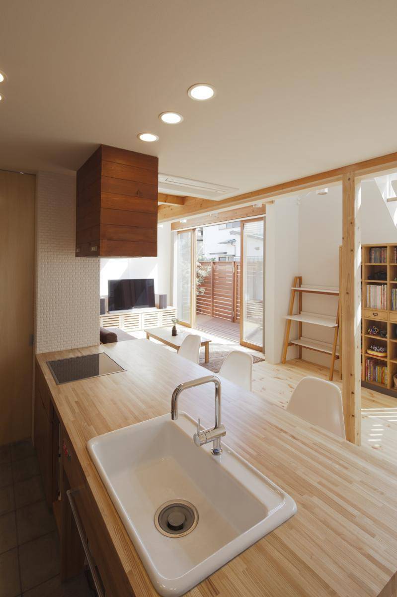 辻堂駅からそう遠く無い商店街に隣接した住宅地の角地に位置し、LDKから吹 抜・ロフトに繋がる木製の外部建具が印象的な家である。
