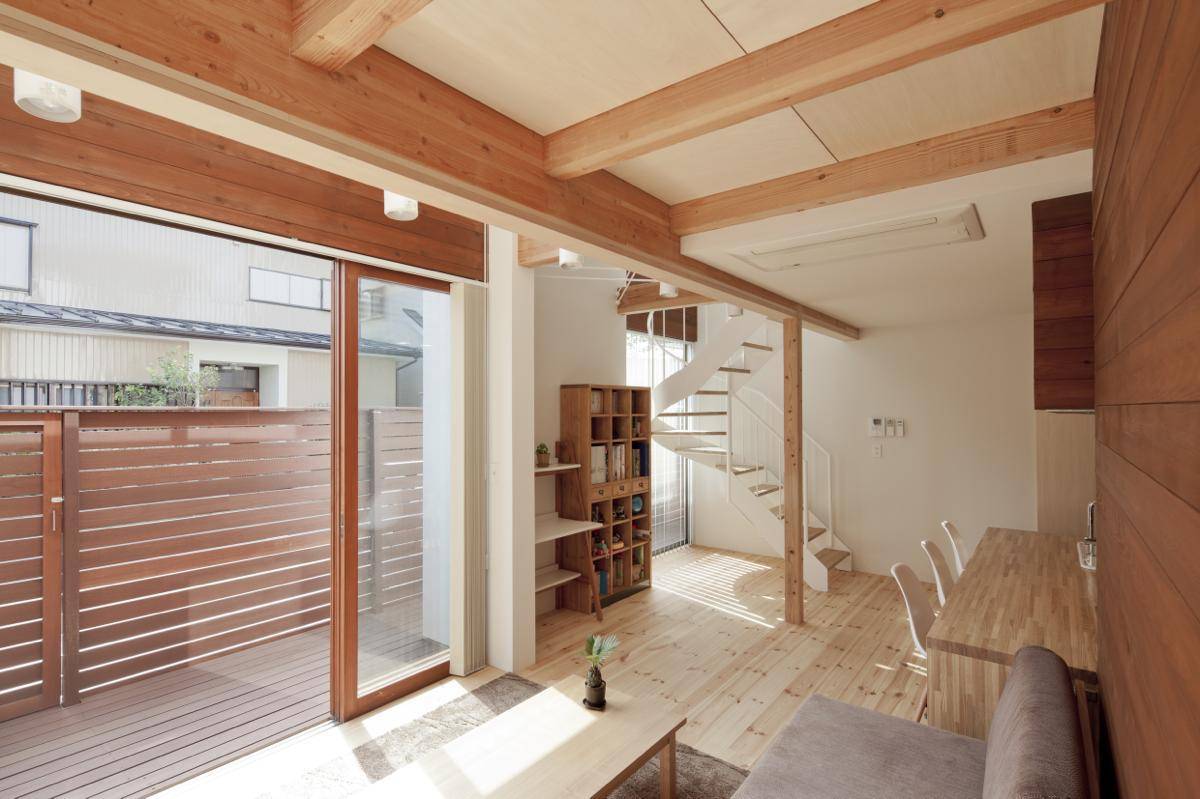 1F 南側デッキは水廻りからリビングまでの目隠しとなりプライバシーを守りながら 外部空間を楽しめるスペースとなっている。