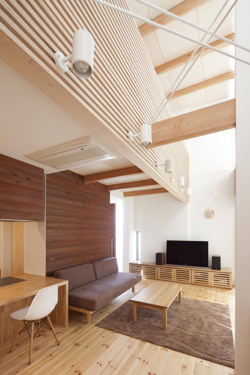建物はオープンでありつつも動線とプライバシーに配慮した計画となっている。 LDKの南側は吹抜、階段を配した開放的な空間構成であるが、玄関からは納 戸を抜けキッチンへ、水廻りへ、そして2階へとリビングを横切ることなくアクセ ス可能。ロフトを活用することで将来への対応も視野に入れている。外部、内部 ともに仕上げ材として木を多く使用していることから全体に柔らかな雰囲気では あるが、タイルなどをアクセントにスタイリッシュな一面もあり変化をつけた。