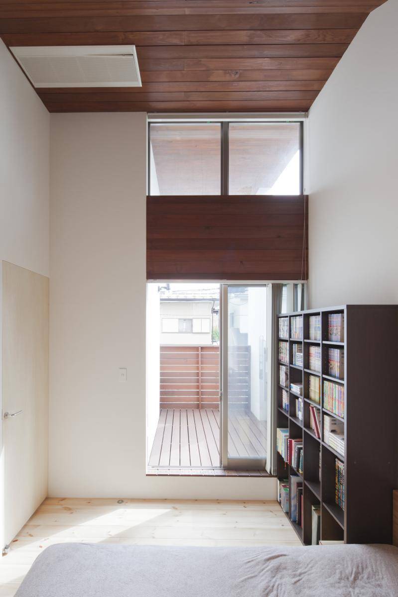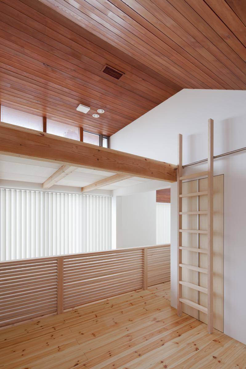 小さな家ではあるが1階LDKから2階をつなぐ吹抜をもち、さらに吹抜上部に子 供室からつながるロフトを設けて立体的に空間を構成することで法的な容積率 のなかで十分な床面積を確保しながらも、家中に光と風を取り込み、開放感と 空間の伸びやかさを得ることを試みた。