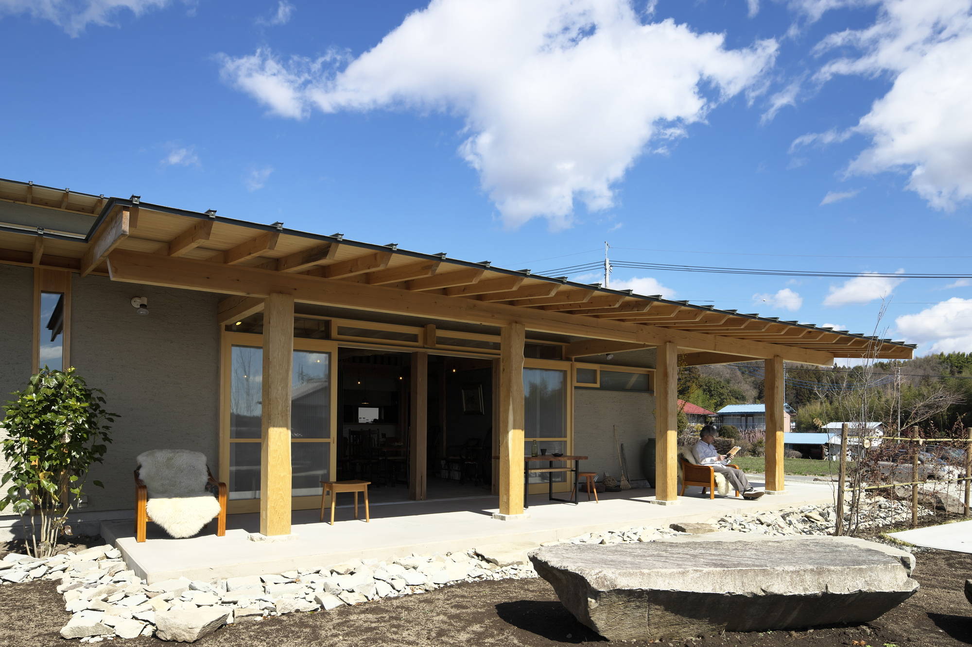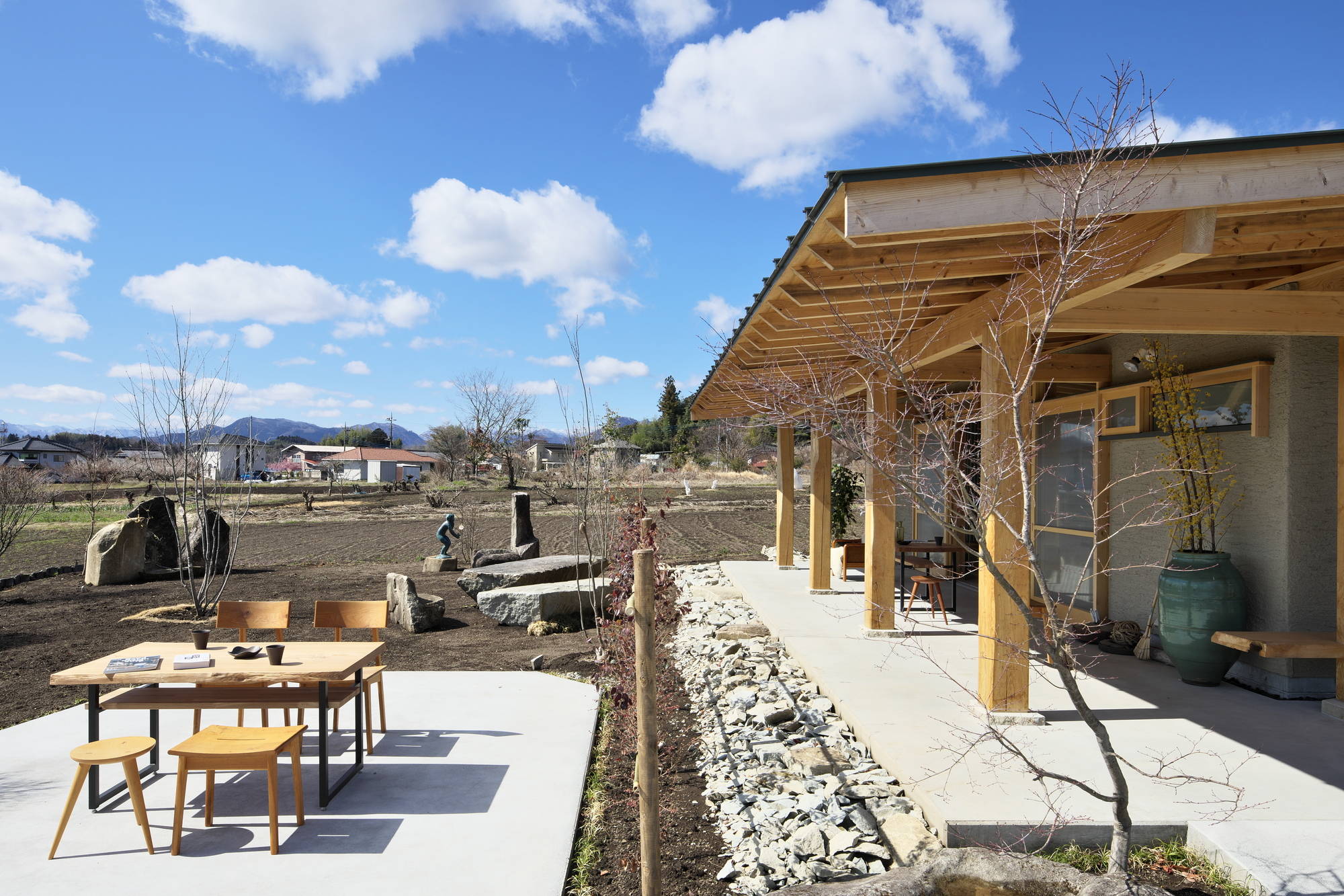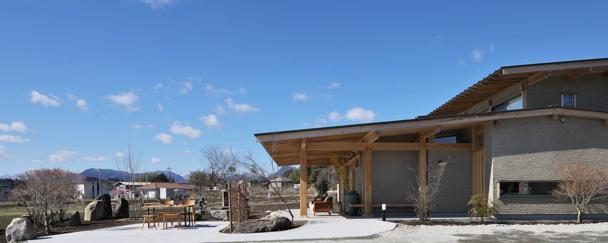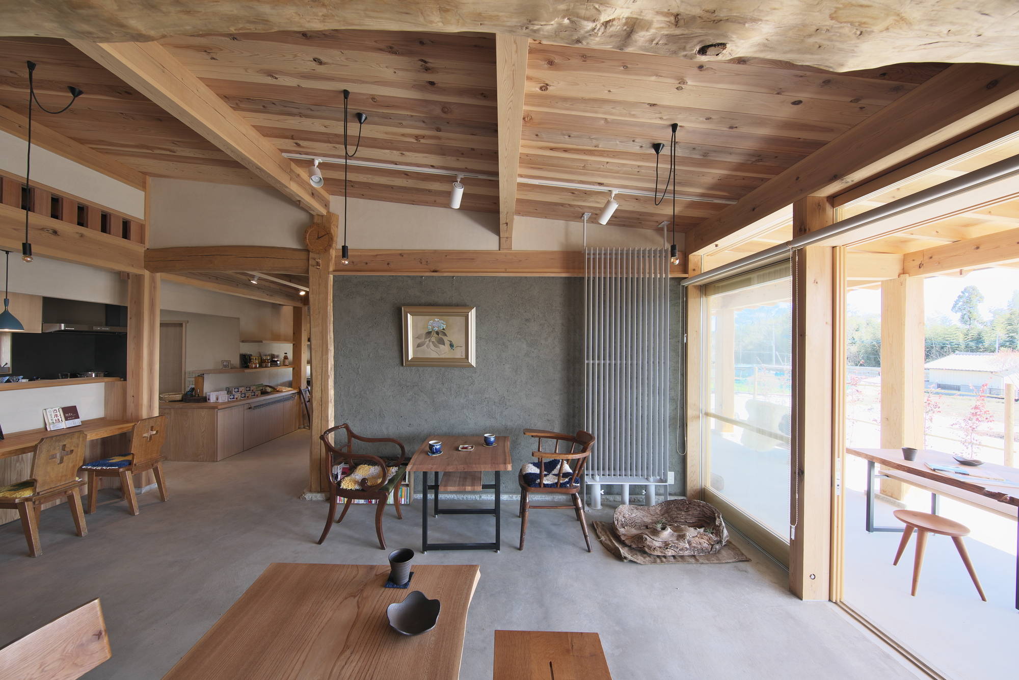 外には南牧村の椚(くぬぎ)石のテーブルと椅子、水鉢、樹木など建主の思いが広がり、その先には遠くの山並みが広がり、客人の心を癒す。