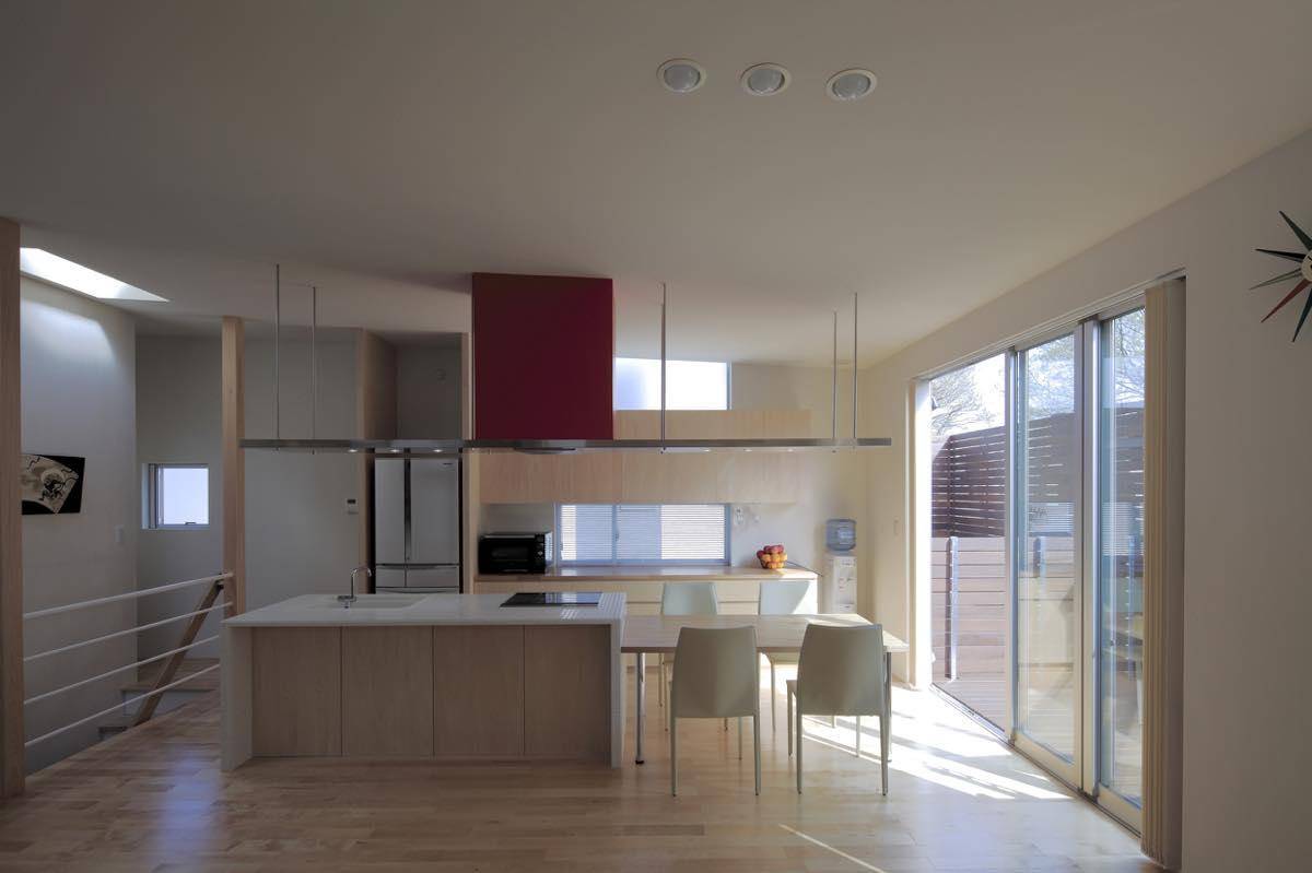 2階のリビングから伸びるブリッジ状のデッキでレベルをつなぐこととし、外部空間を建築に取り込むことで 北側道路側のやや閉鎖的でコンパクトなファサードから受ける印象からは想像がつかないような明るくさわやかな空間を置いた。