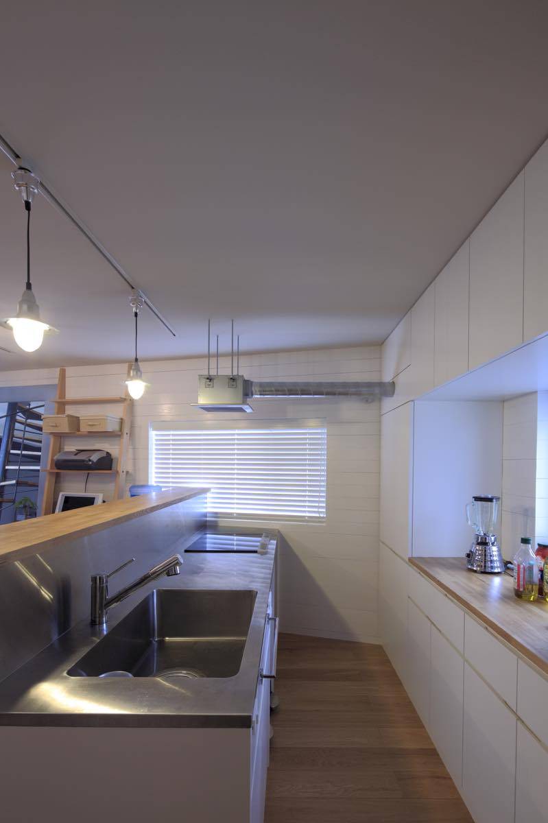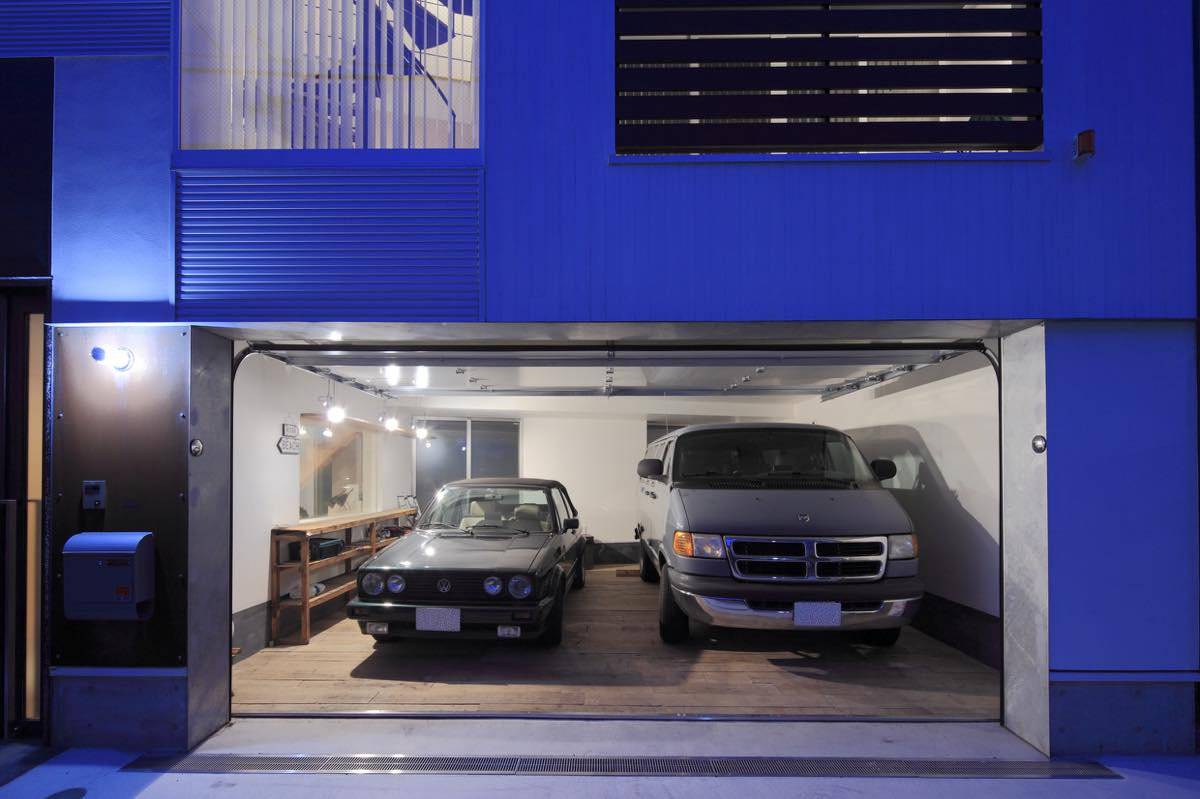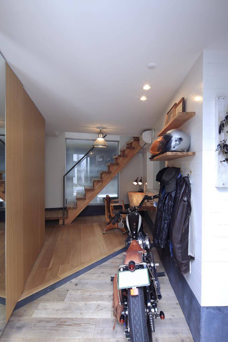 狭小で変形した敷地ながらもクルマ2台分のインナーガレージを持つ家。さらにワークスペースを兼ねた玄関には自慢のカスタムハーレーを収容・展示する。