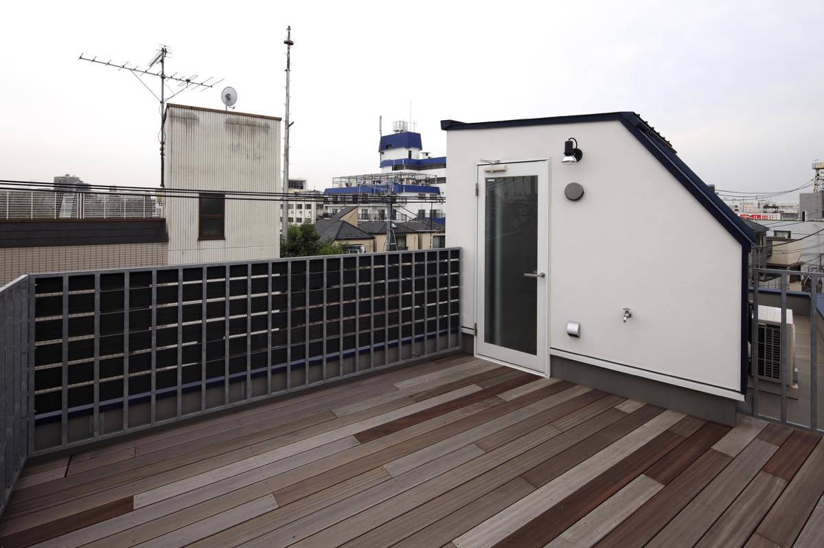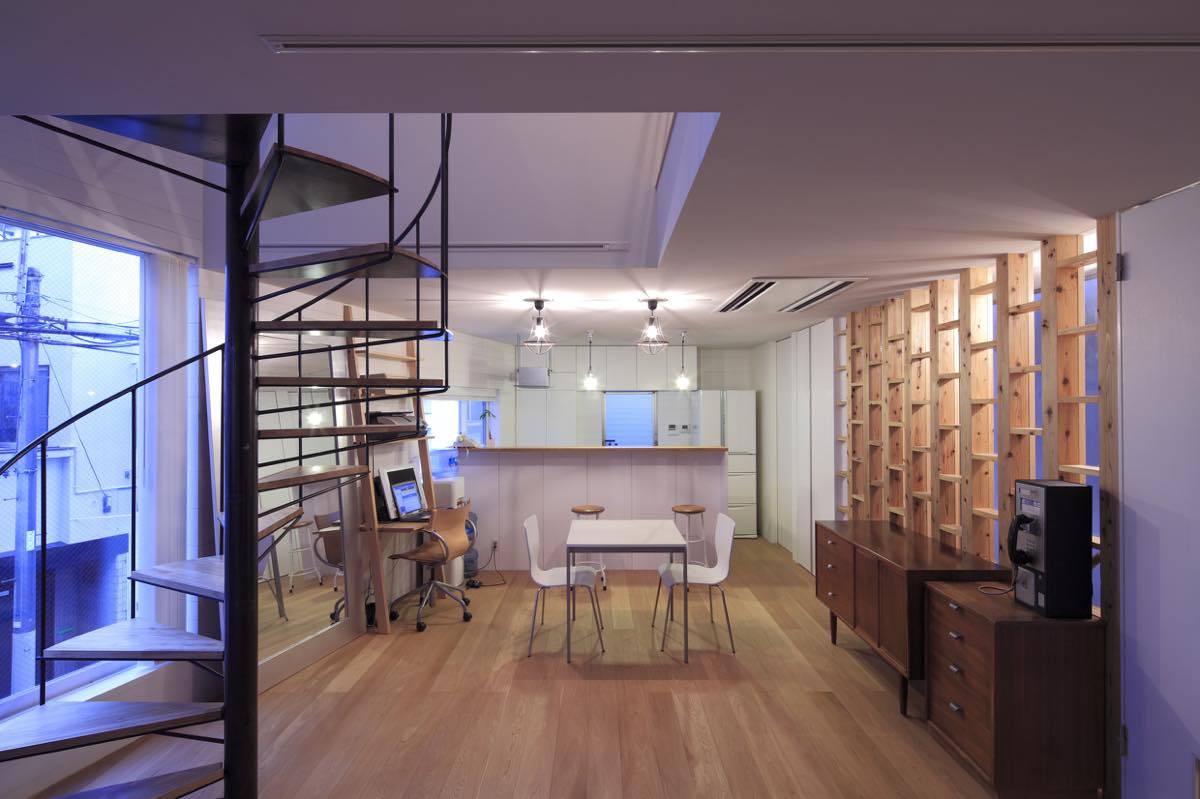 2階に配置したLDKは螺旋階段のある吹き抜けをもち、隣接する客間兼用の和室スペースと普段は一体に使うことにして、面積以上の広がりを感じさせるようにした。3階の個室は北側斜線制限によって削られた斜め屋根がLDKとは対照的にこじんまりとした隠れ家的な雰囲気を醸し出す。最上部にはペントハウスと小さいながらも屋上も実現、都内の住宅密集地にあって開放感を得ることができる。