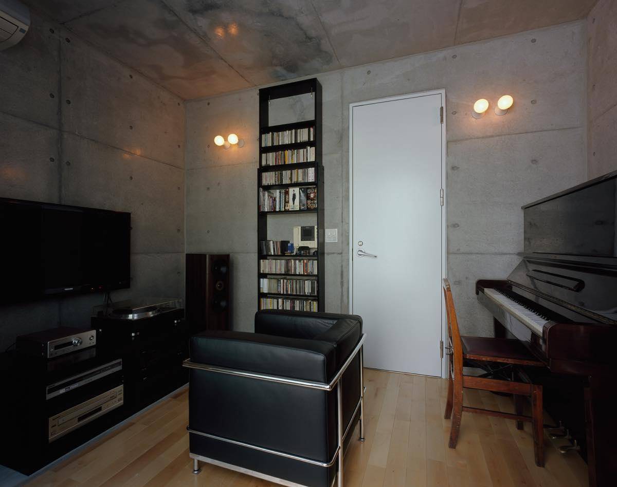 1階は上階に部屋を有しつつ2台の駐車スペースを確保、さらに深夜でも気兼ねなく音楽を楽しむことができるよう防音室を設けたことから、構造的に自由度が高く強度を保つことができて、かつ防音効果も高いRC造としました。