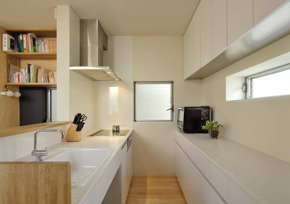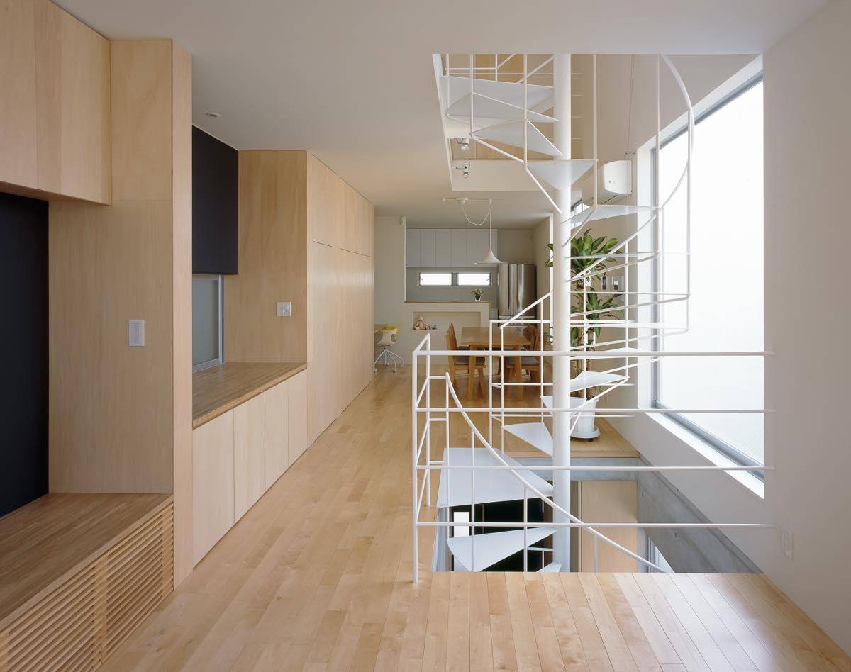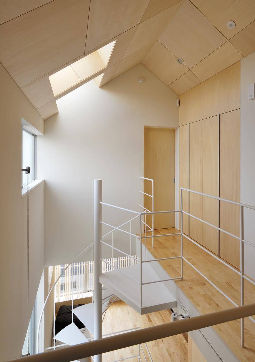 3階には主寝室と各子供室を配置。それぞれ閉じた空間としていますが吹き抜けを通じて、なんとなく互いの存在が感じられるようにしています。開閉型のトップライトを階段吹き抜け上部と各室に設けてあり、温度差によるドラフトを利用した空気の流れを作り、狭い敷地ながらもなるべく自然の風で快適に過ごせるように工夫しています。