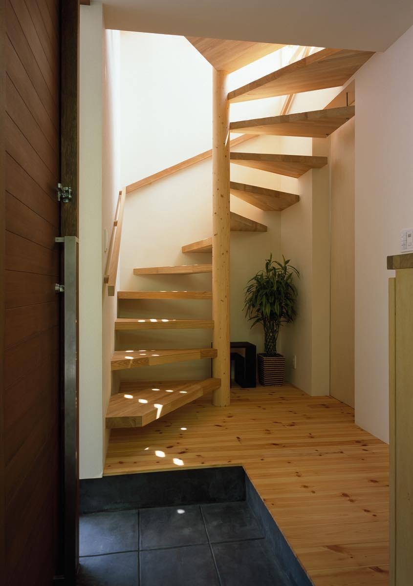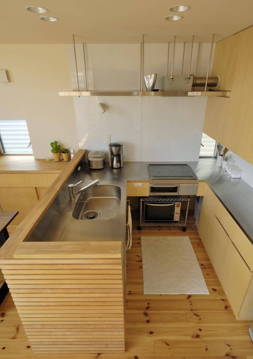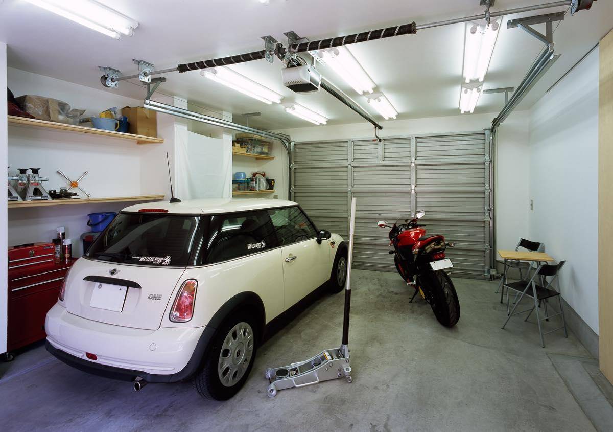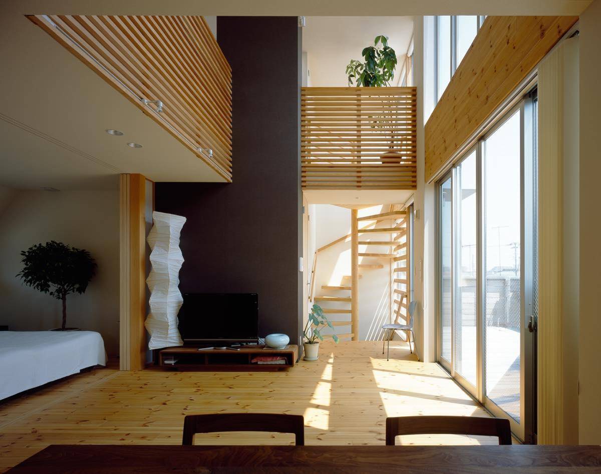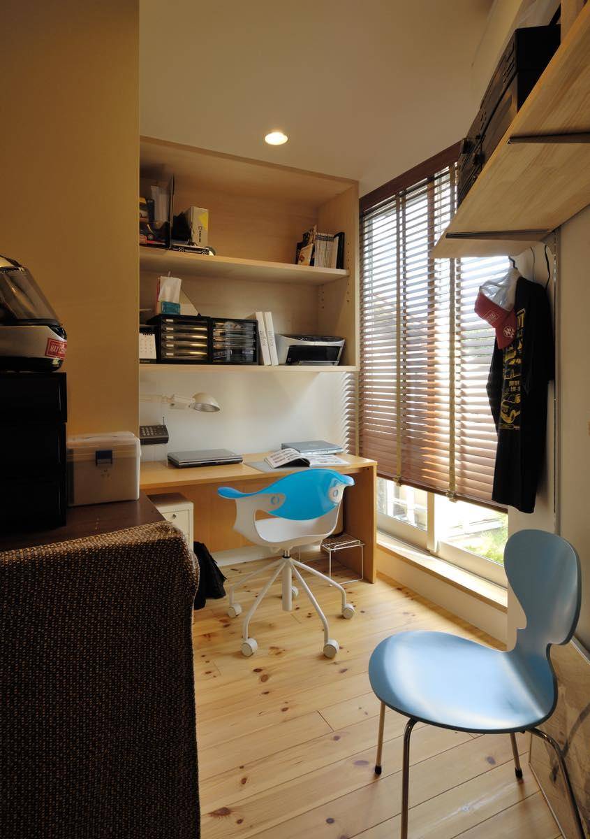 趣 味と実益を兼ねた広々としたインナーガレージを持った3階建ての住宅です。約30坪と決して広くはない敷地ですが、1階に倉庫も兼ねた書斎(事務室)とク ルマ2台バイク1台を収容できるビルトインのガレージがあります。このガレージは本業であるコーテングの作業場や修理工場としても活躍します。外部にもク ルマ1台・自転車3台を置くスペースを確保、敷地を有効に使う工夫がされています。住宅密集地の中にあるため、環境の良い2階にリビングを配置、さらに吹 抜けを設けて採光と通風を得る工夫をしています。 このLDKに隣接してベッドルームを配置。ふだんは可動間仕切りの建具を開け放ち、ワンスペース・リビングとしてゴロゴロする場所に使うことができ、限ら れた床面積の中でも広々とした使い方ができるよう提案しました。