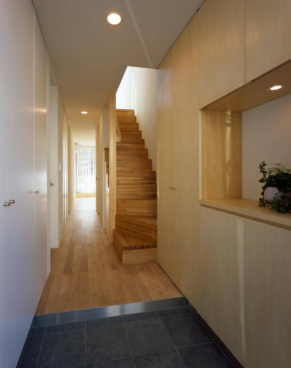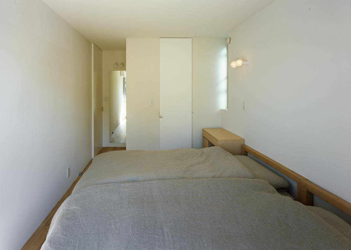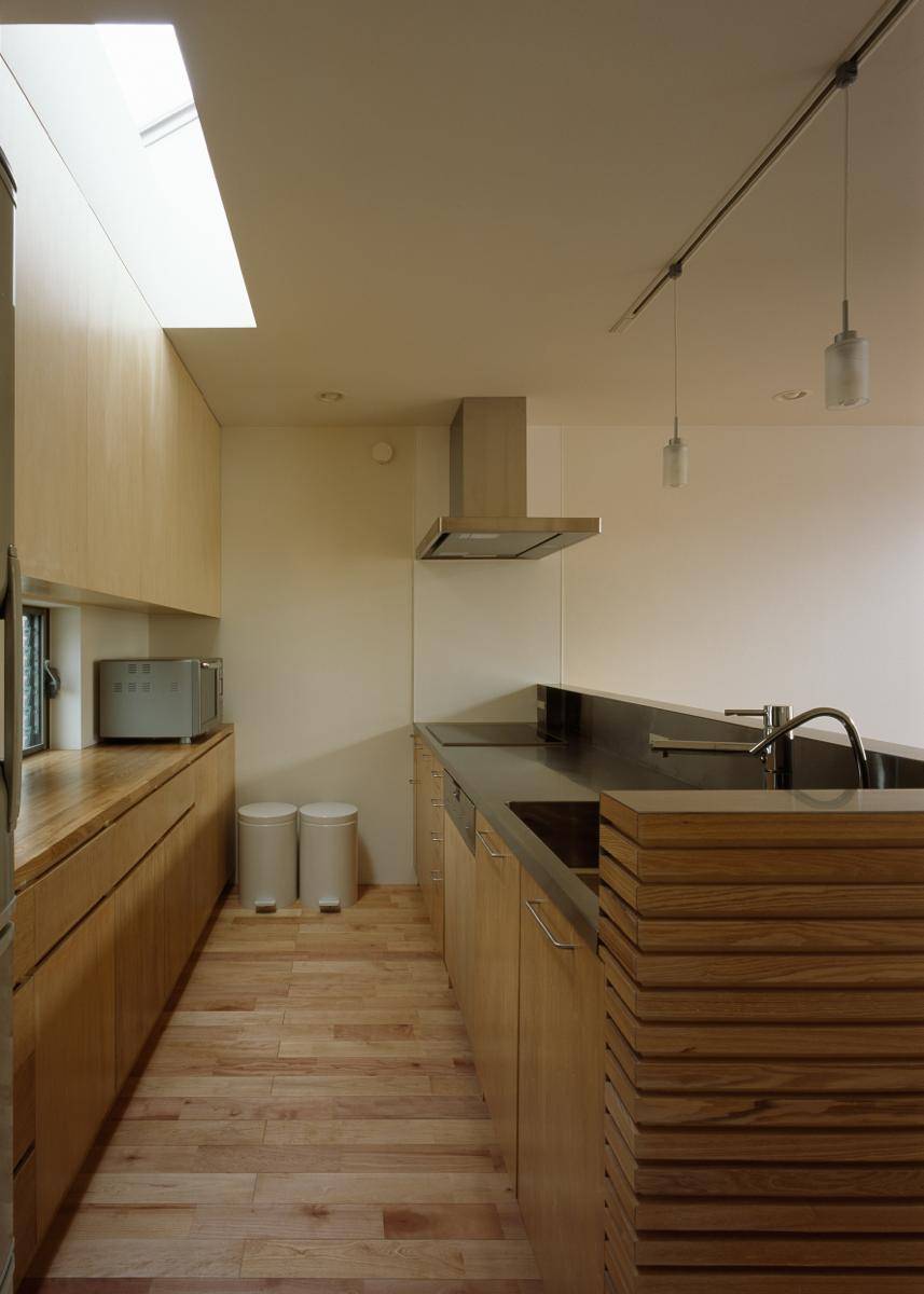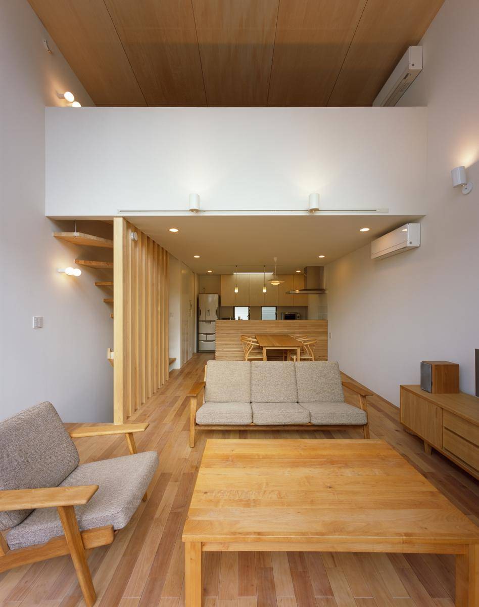敷地面積が小さい事、開放的なリビングを望んだが川沿いに遊歩道がありプライバシーの確保が必要な事から、2階にLDKを配置した。