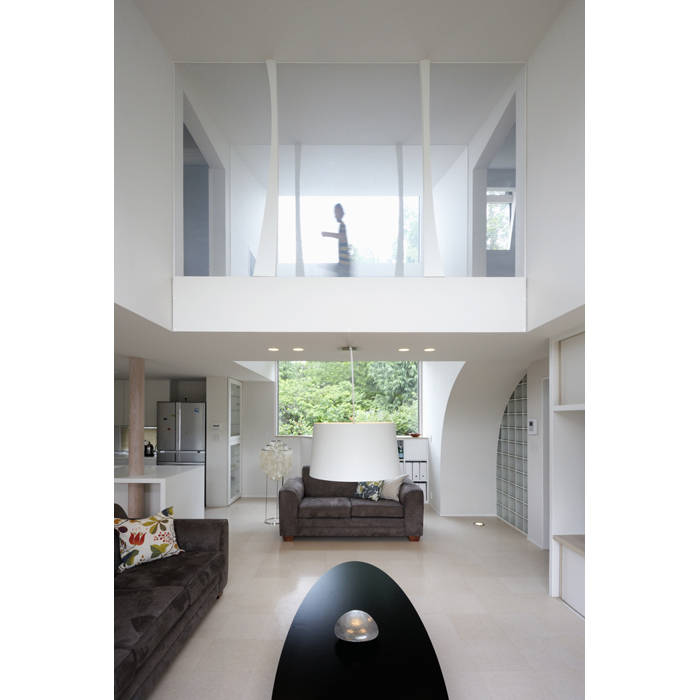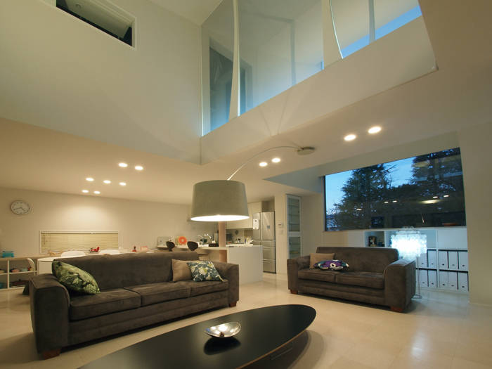 緑の風景が取り込まれたインテリアは、大きな吹き抜けを介して、家族の気配が分かるようになっています。