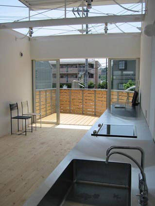 設備面では、都市ガスが未整備のため、火災の恐れの少ないオール電化住宅にしました。鉄骨造のシャープな印象に合わせたステンレス製の特注キッチンを設えています。