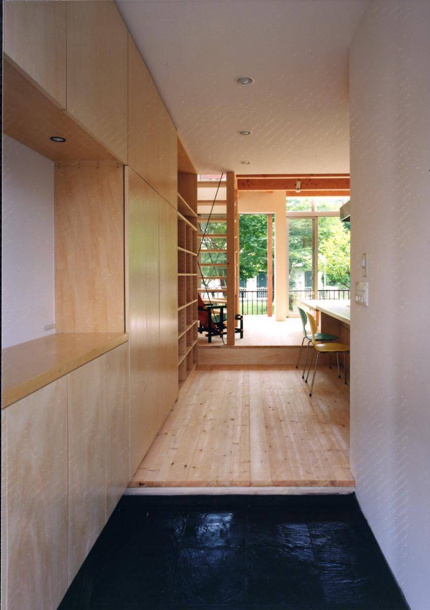 陽当たりが悪い場合の常套手段として2階にリビングを配置することが多い。しかしこの計画では「東側に山林」があり「自宅で仕事と育児と家事を両立する奥さん」、「多くの友人が気軽に出入りする」といった諸条件から1階にLDKと仕事場を配置、2階にプライベートな寝室と水回り、更に3階レベルにロフトを設けた。