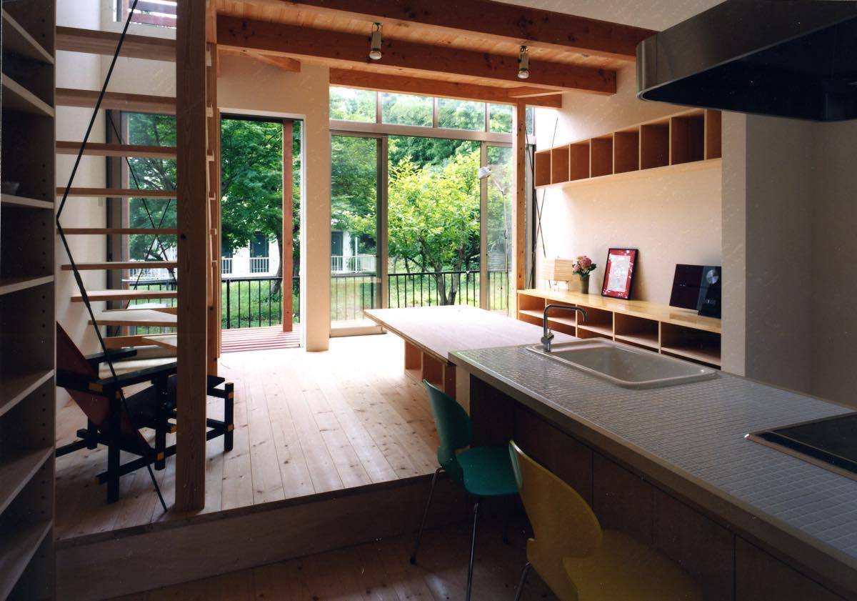 床座で座る人、キッチンに立つ人、カウンターの椅子に座る人、それぞれの目線の高さが近づくことでコミニュケーションの取りやすさに配慮する目的で、それぞれの場所の床レベルには3段階の高さの変化をつけている。 山林側を全開口とし、トップライトやハイサイドライトを設けて暗さや狭さを感じさせないことを目指した。まるで自分の庭のような隣地の山林を借景に、まるで別荘のような居心地を感じる空間が実現できたと思う。